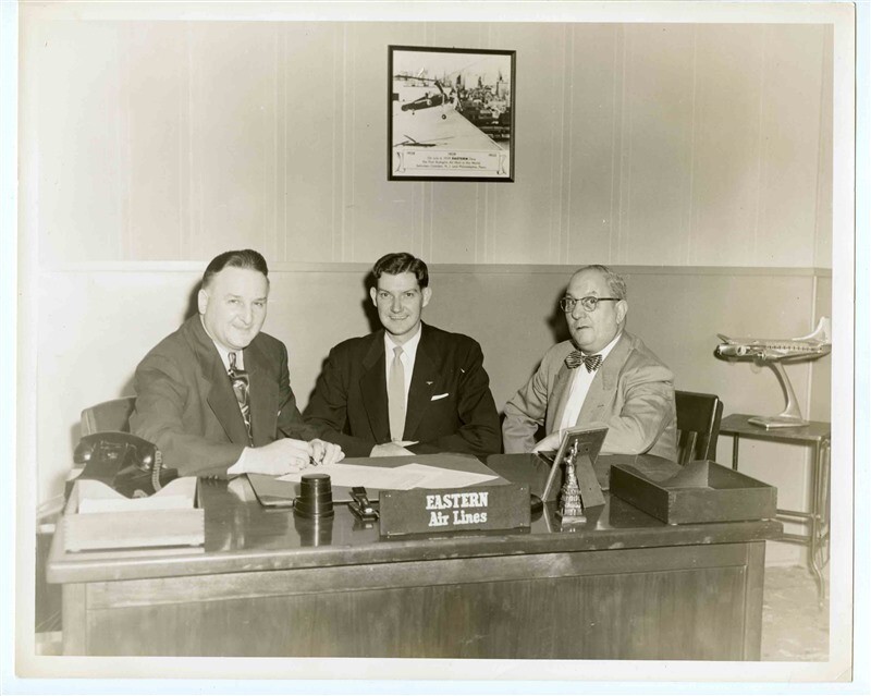 A lot of 2 different Eastern Airlines 8x10 Black and White Photos . Place and people unknown. Nice view of Air Stairs in one photo and of Model of Airplane in the other, Plus an interesting photo on the wall. Circa 1940's.
