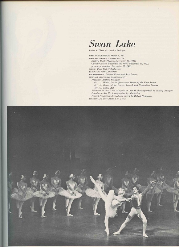 A souvenir program from 1957 of The Royal Ballet, by Sol Hurok, with a history by Clive Barnes,. Featuring Guest Artists Margot Fonteyn and Rudolf Nureyev. With information, photos and synopsis of many ballets, including, Romeo and Juliet, Swan Lake, Les Sylphides, Daphnis and Chloe, The Dream, A Wedding Bouquet, Giselle, Marguerite and Armand, The Invitation, Laurantia, La Bayandere, Les Patineurs, and more.
