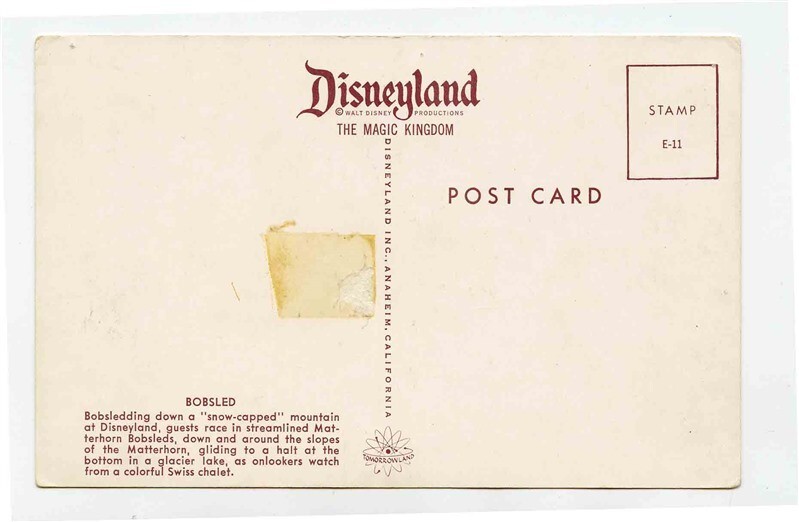 An unused Disneyland postcard. Bobsled Postcard From Tomorrowland with E-11 in the stamp box.