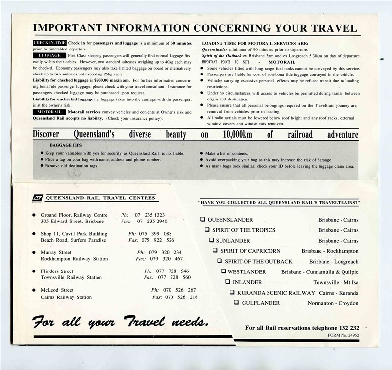 Traveltrain Queensland Rail Ticket Folder Ticket and Schedules Spirit of Outback