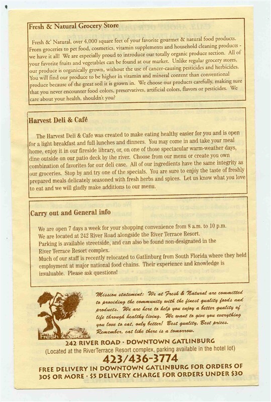 A 4 page paper menu. Fresh Natural Menu. Located on River Road in Gatlinburg Tennessee Also includes Harvest Deli Cafe . Measures about 5 1/2" x 8 1/2" when closed. Circa 1990's