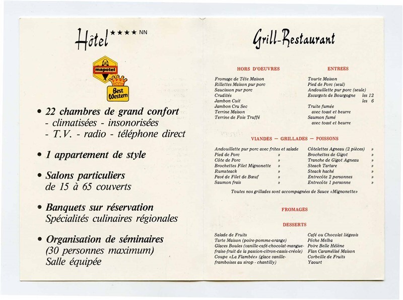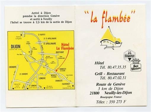 A 4 page pocket size souvenir menu and brochure. La Flambee Hotel Grill Restaurant Menu.Located on Route de Geneve in Neuilly les Dijon France . Measures about 3 1/8" x 4 1/2" and has a map onthe back cover. In French.