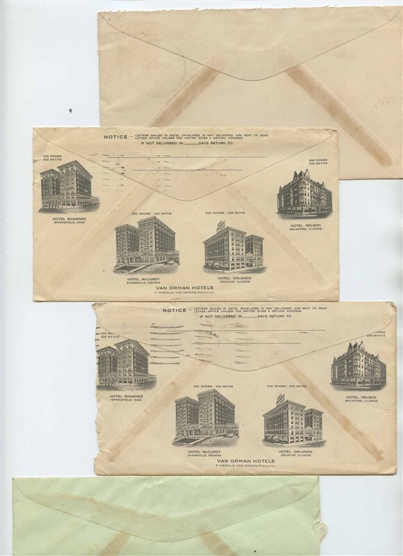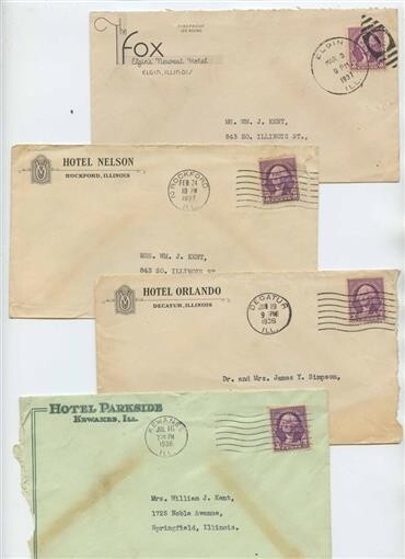 4 different Illinois Hotel Covers from the 1930's . Includes the Hotel Nelson in Rockford, the Hotel Orlando in Decatur. the Hotel Parkside in Kewanee and the Fox Hotel in Elgin. All measures have been opened and have no contents. Each measures about 3 5/8" x 6 1/2". All have stamps and clear cancels.