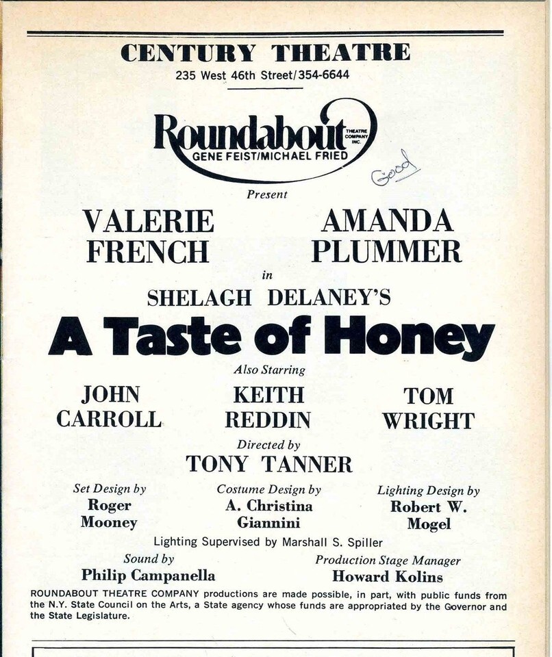 A Playbill for A Taste of Honey from a 1981 performance at the Century Theatre in New York City. In fine condition. Starring Valerie French, Amanda Plummer, John Carroll, Keith Reddin and Tom Wright