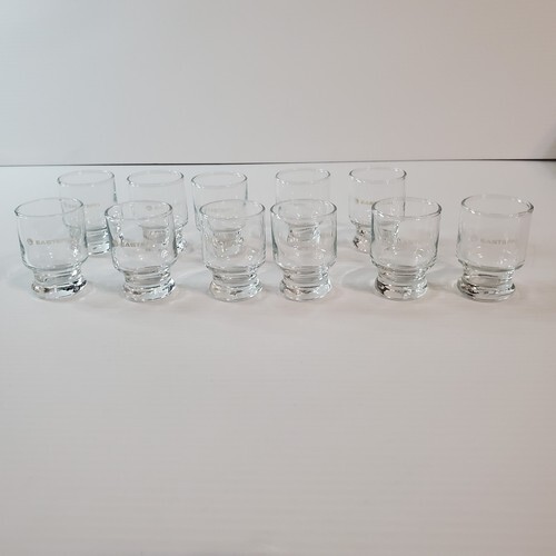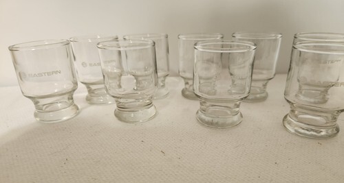 An Eastern Airlines BIG E prototype large shot glass, During the Eastern Airlines Strike which began in the late 1980's. prototype Pilot Wings, Flight Attendant Wings, Badges and other items were prepared for possible use. Each had what is known as the BIG E design. This is one of those original items. These were not placed in service. This clear glass over sized shot glass measures about 2 1/2" high and has a bottom diameter of about 1 1/2" and top diameter of 2 1/2". Now you can own a bit of Eastern Airlines History