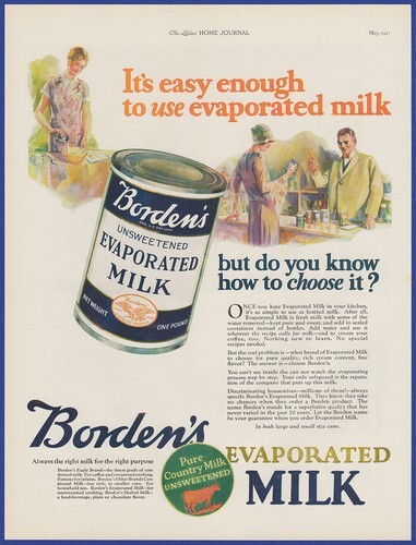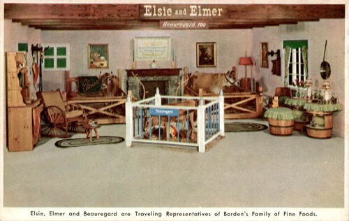 An unused Borden postcard featuring Elsie and Beauregard in Person. Spool bed and corral playpen