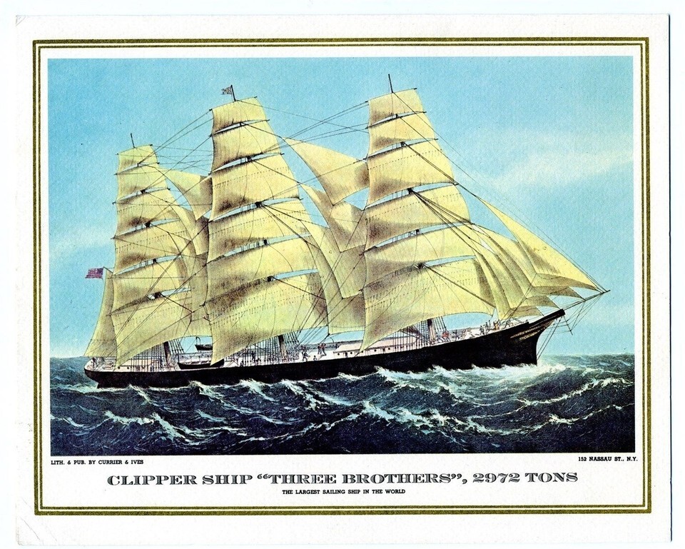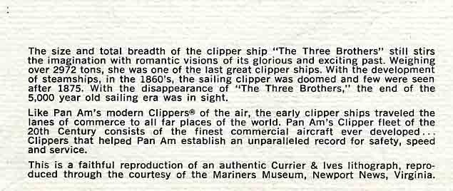 A Pan American World Airways President Special Menu with cuisine by Maxim's de Paris. In very good condition. Circa 1970's. On the cover is a Currier Ives reproduction of the Clipper Ship Three Brothers . Measures about 8 1/2" x 7" when closed. On the back of the menu is the history of the ship and on the Pan American Clipper Ship Service.
