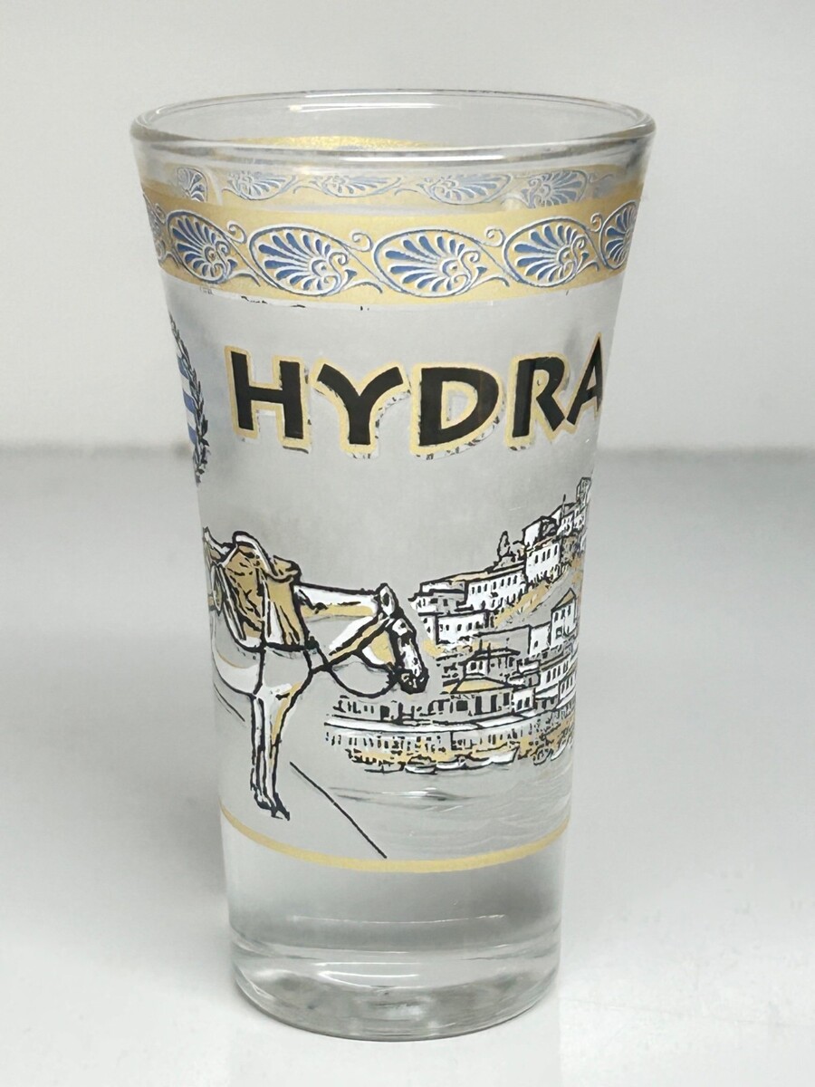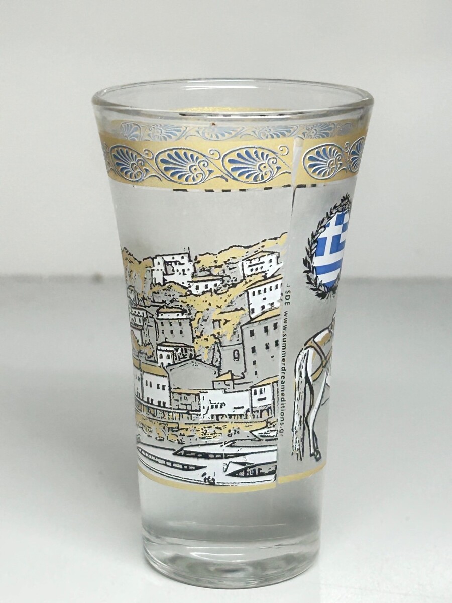This shot glass, adorned with intricate gold detailing and vivid illustrations of Hydra's picturesque landscapes, embodies the charm and culture of the Greek island. A lovely keepsake or addition to a collection, it whispers stories of serene harbors and timeless beauty.