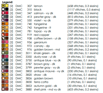 Colour legend and specifications – All floss codes, stitch counts, and finishing tips included.
