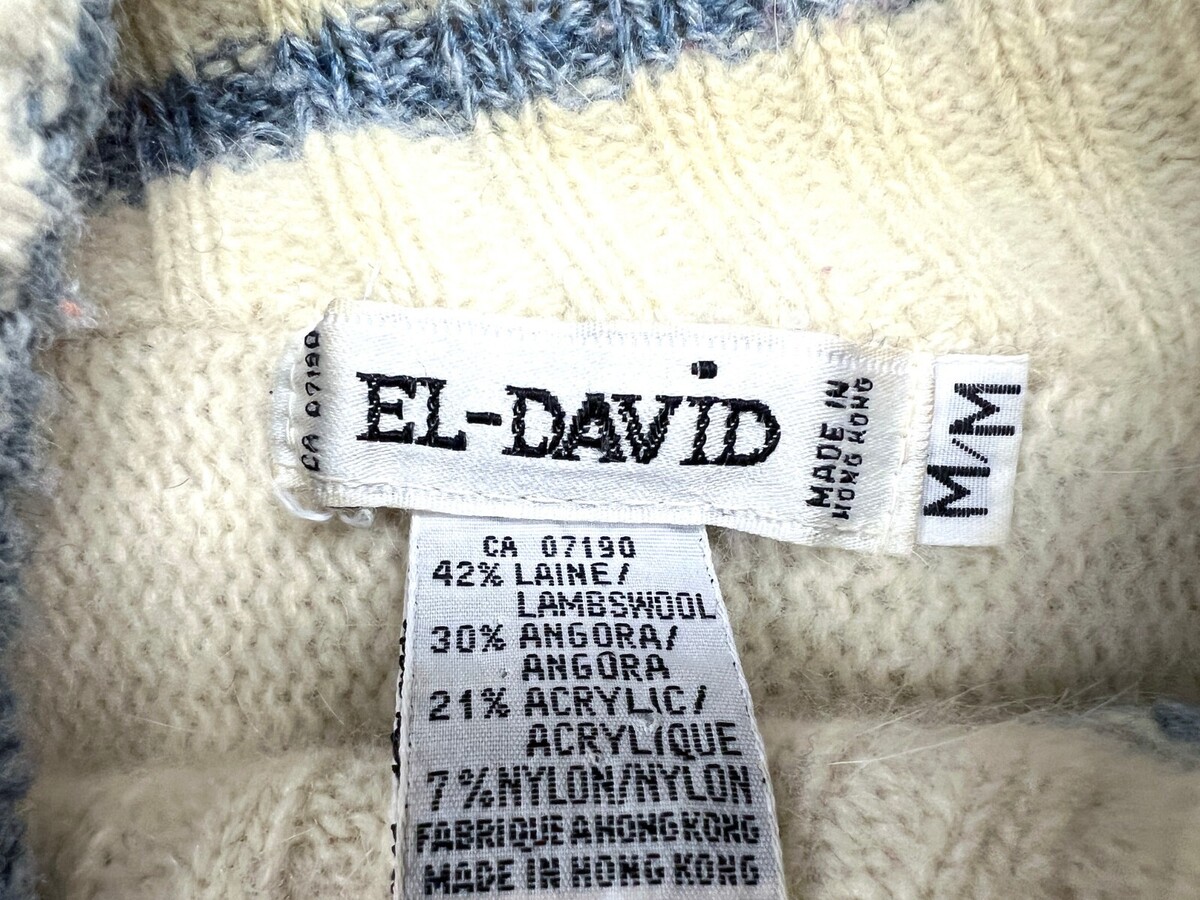 El-David was a boutique knitwear label producing high-style sweaters during the 1980s. Their use of angora blends and bold design lines reflects the era?s penchant for luxury, texture, and statement silhouettes.