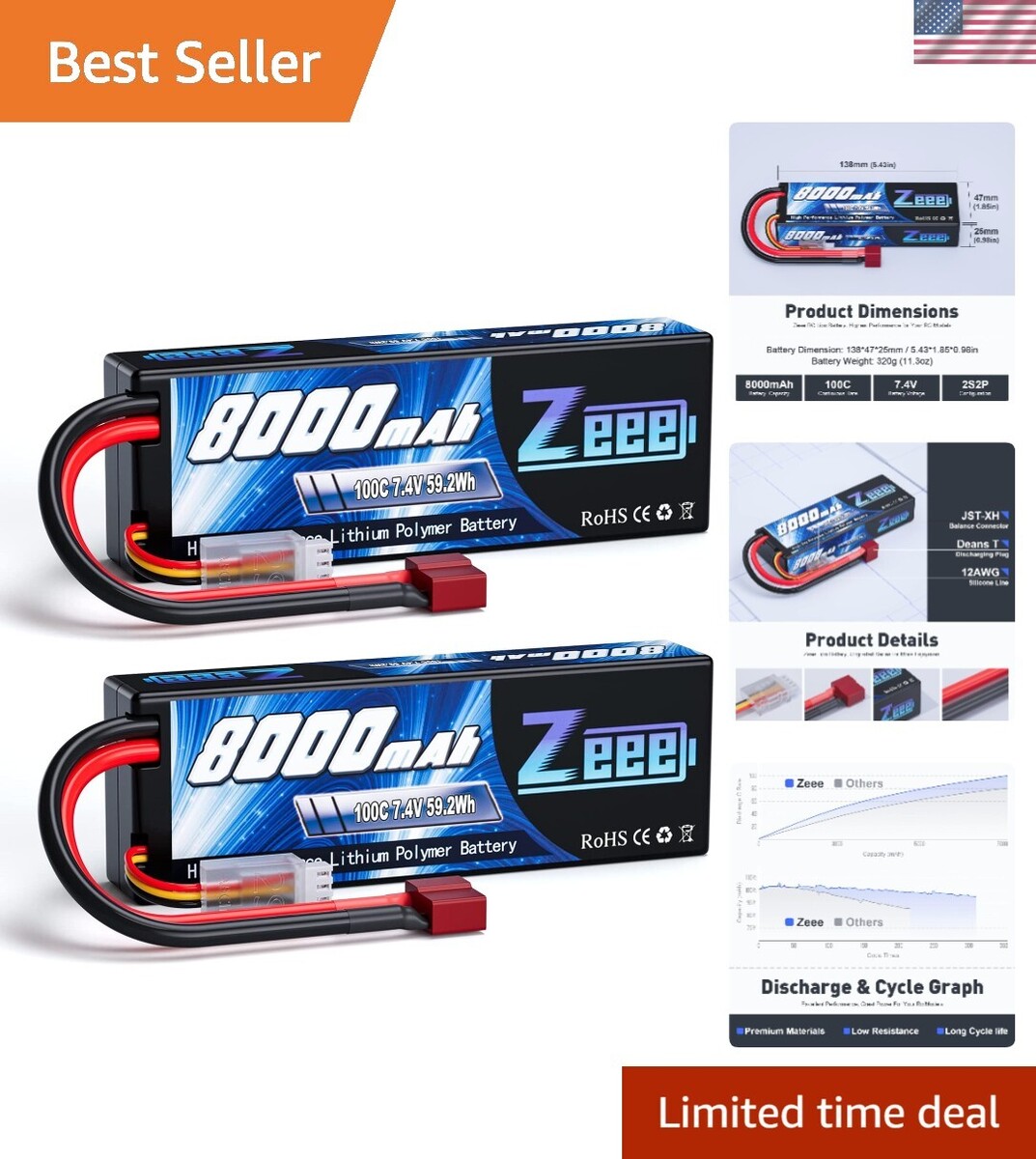 ?What You Get?- 2 Pack of 100C 8000mAh Lipo Battery with Deans Connector. Any product problems, please contact me: 1. Enter into "Your Orders" to click "Contact Seller" option; 2. Click "Ask a question" on our storefront. We will get back to you within 24 hours.
