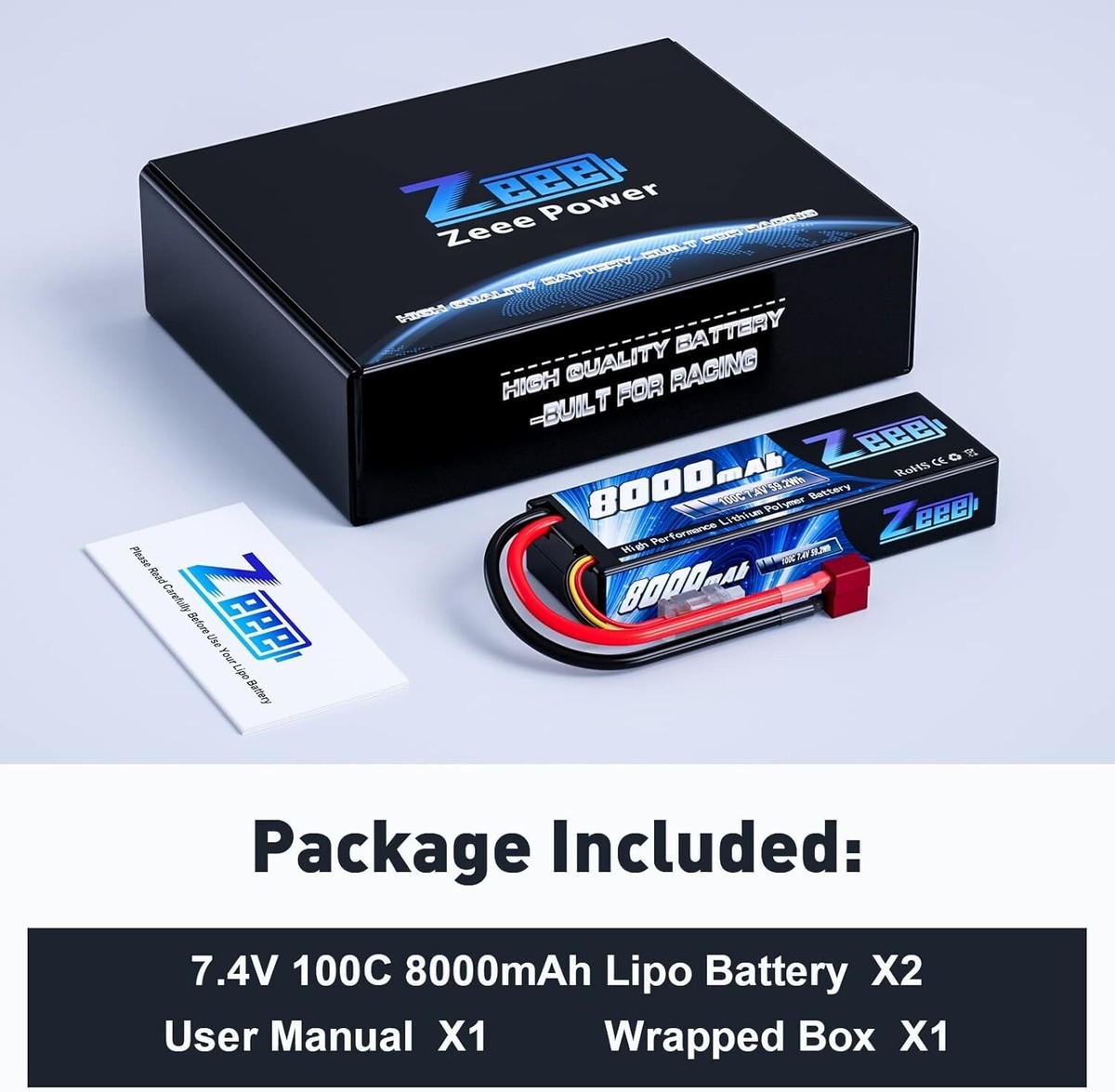 ? 2S 8000mAh Battery Specification?- Battery Voltage: ; Configuration: 2S2P; Capacity: 8000mAh; Discharge: 100C; Plug: Deans T Connector.