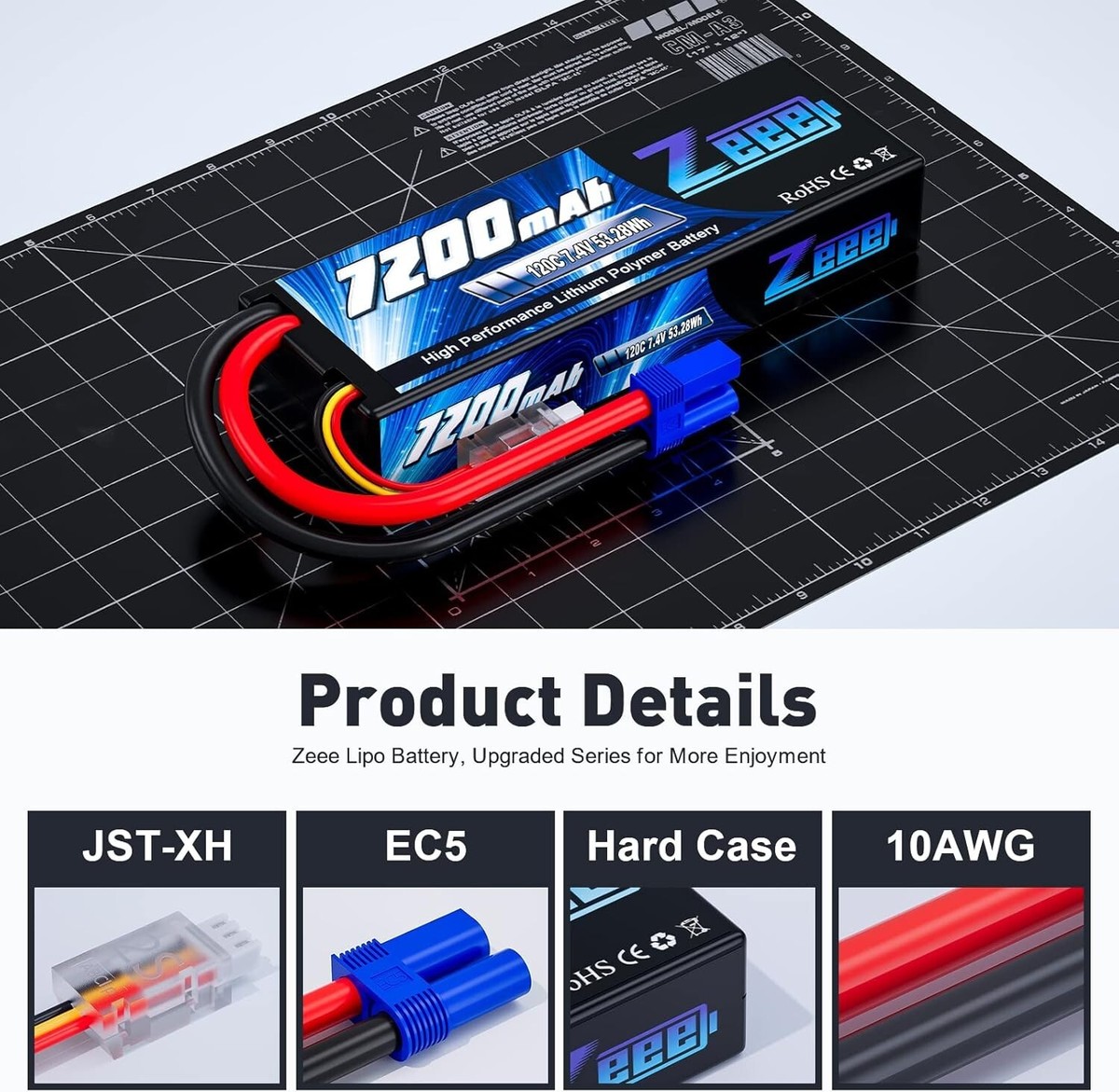? 2S 7200mAh Lipos Specification?- Battery Voltage: ; Configuration: 2S1P; Capacity: 7200mAh; Discharge: 120C; Connector type: EC5 Connector.