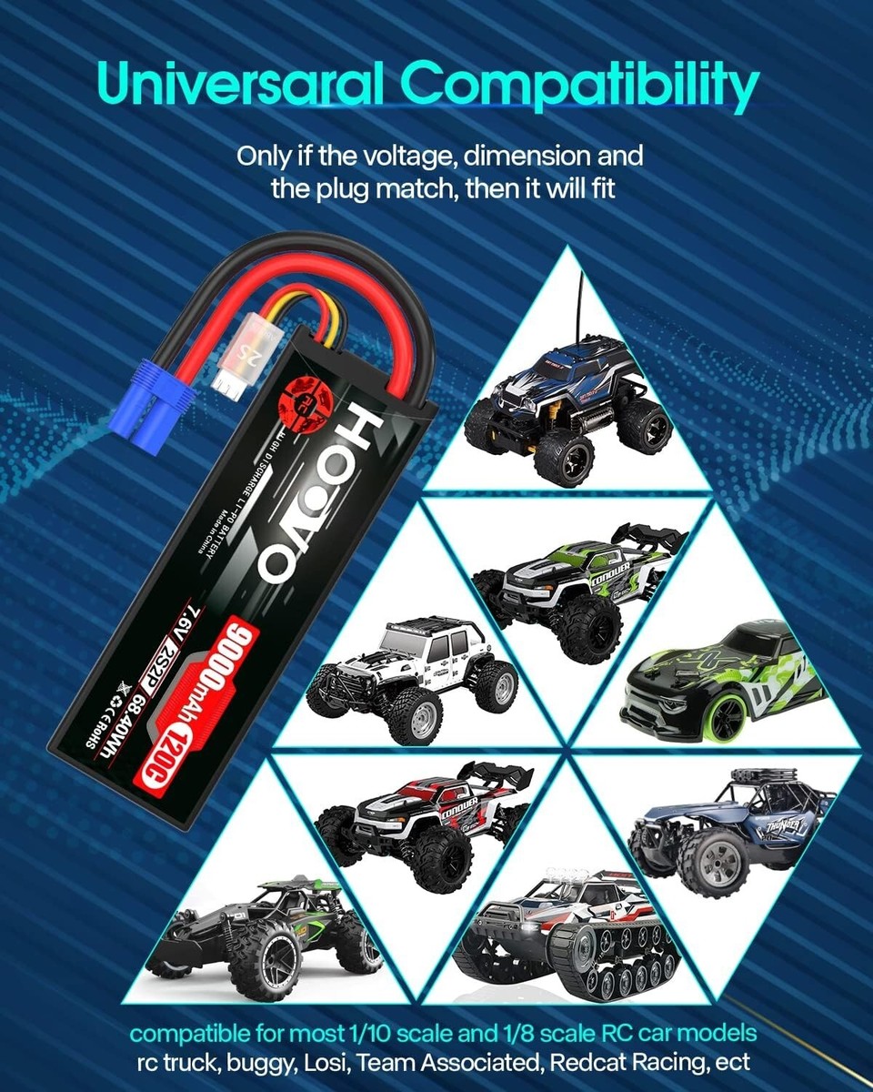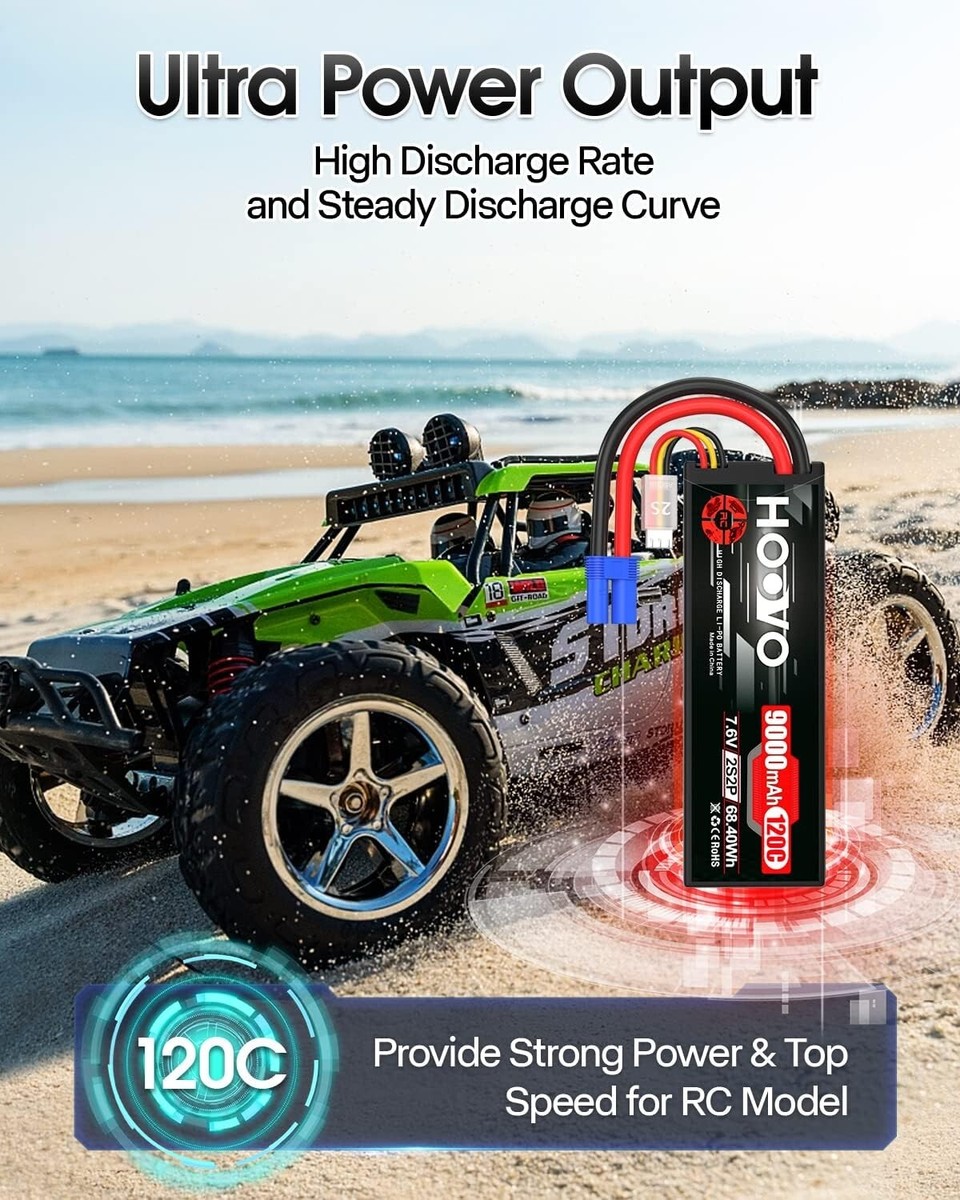 ?High Performance?- 2S Lipo battery 9000mAh, High capacity, Long Cycle Life, up to 300Wh/kg energy density; Lipo batteries provide steady discharge curve, high discharge rate to reach the top speed with the most stability and power your RC hobbies; More run time, more fun time.