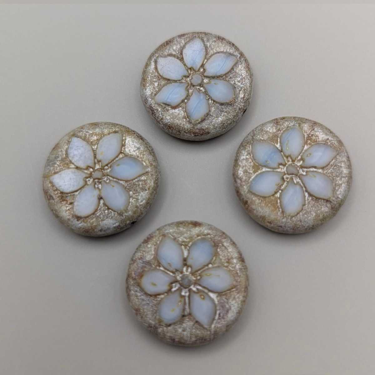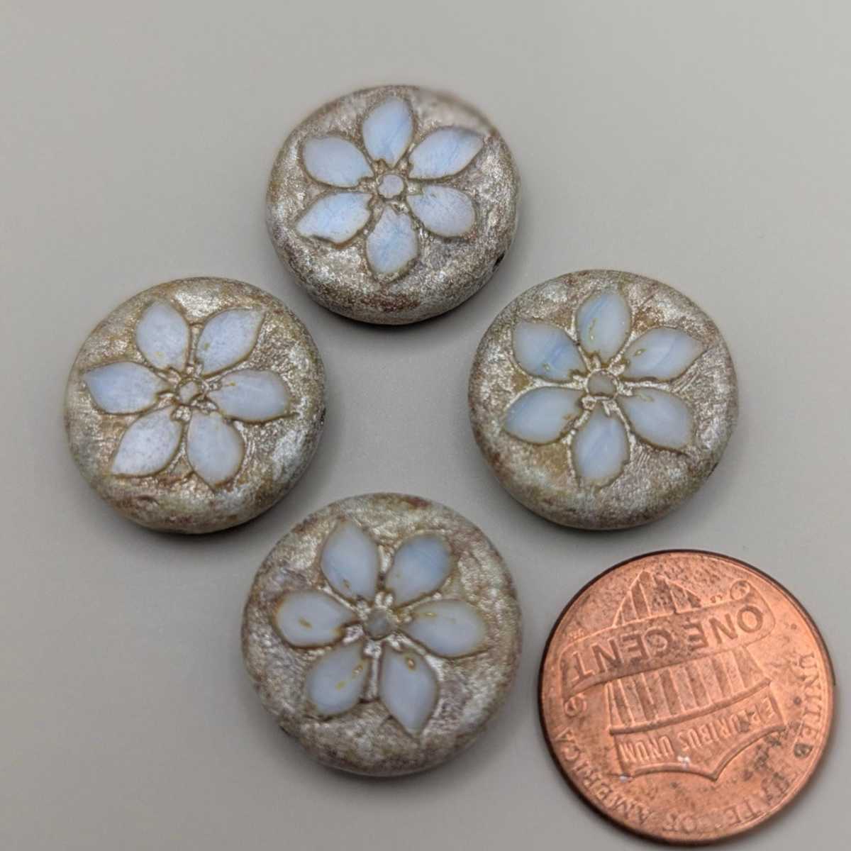 Bring a touch of coastal elegance to your jewelry designs with these stunning Czech glass table-cut coin beads. Each 18mm bead features a beautifully detailed six-petal flower, highlighted in a soft light-blue hue with a silver-gray inlay and a rustic travertine finish. The table-cut surface creates a smooth, polished face that showcases the floral design with exceptional clarity and depth.