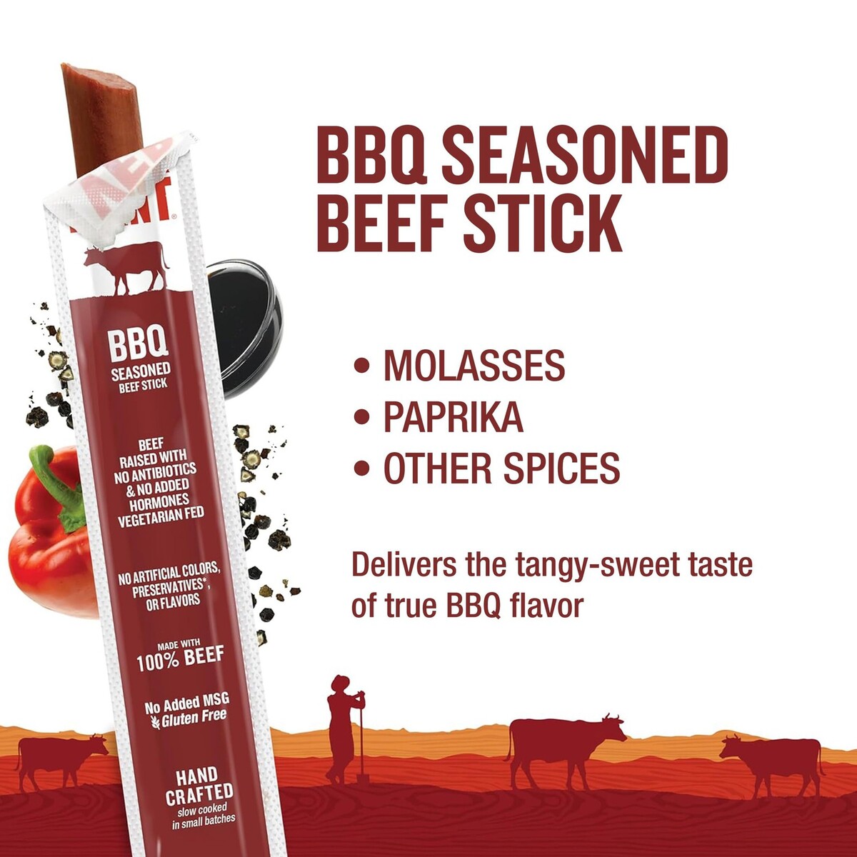 Dated 4/28/2025 24 Sticks ? PERFECT ON-THE-GO SNACK - Individually wrapped snack sticks for easy on the go protein snacking ? PROTEIN MEAT STICK - 1oz meat stick is a 100 calorie snack, 6g of protein and 2g of Carbs. ? QUALITY PROTEIN ? Sticks are made from animals raised without antibiotics or hormones for a pure and hearty flavor - Hand crafted, slow cooked in small batches in our onsite smokehouse ? DIET friendly APPROVED - Jerky sticks are made with no artificial colors, presevatives, or flavors. No added MSG, Gluten-Free ? FULL OF FLAVOR - Seasoned with molasses, paprika and other spices for a tangy-sweet taste of true BBQ flavor.
