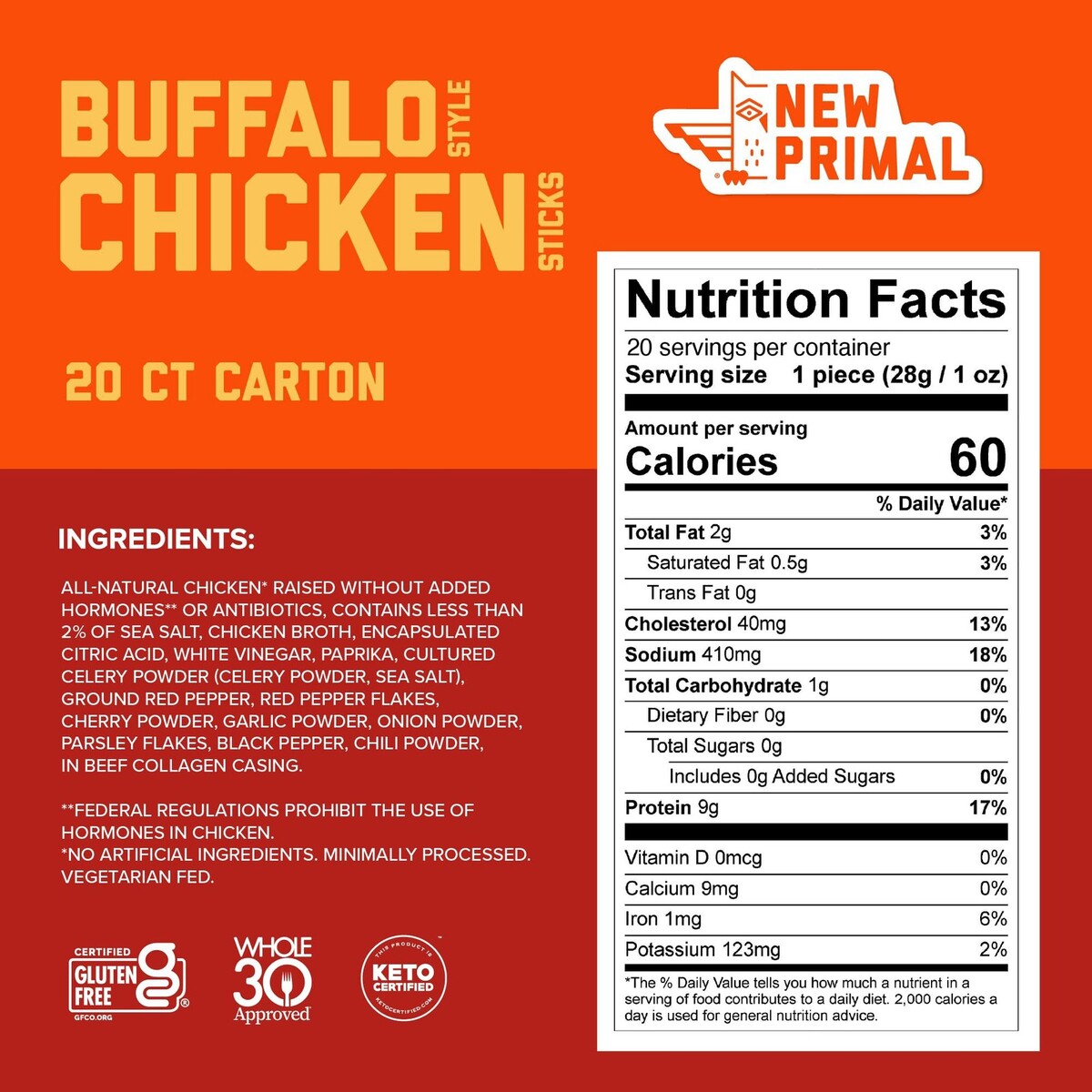 Dated 10/22/2025 20 Sticks ? BUFFALO STYLE CHICKEN STICK: Tender, all-natural chicken infused with our punchy medium buffalo sauce. Formed into a delicious easy to eat stick that?s perfect for convenient snacking at home or on the go. This keto snack pack contains 20 - 1oz sticks. ? HEALTHY SNACKS FOR ON THE GO: Our healthy snacks for adults are great for snacking anytime and anywhere, whether you're at the office, at school, traveling, camping, backpacking, running errands, or relaxing at home. These mess free individually wrapped snacks are easy to eat on the go compared to beef jerky or other meat snacks! ? 9G PROTEIN PER SERVING: New Primal buffalo chicken sticks are the perfect high protein snacks, that are portable and easy to eat. Each chicken meat stick has 9g of protein and just 60 calories per stick. ? KETO, GLUTEN FREE SUGAR FREE: Top 8 allergen friendly! Our chicken jerky sticks are made with all-natural chicken, 0g of sugar, Whole30, paleo, keto, gluten free, and raised without added hormones or the use of antibiotics. ? NEW PRIMAL: Our convenient low sugar and low carb protein snacks pack crave-able flavor, simple ingredients, and plenty of protein into one easy to eat stick. Delicious, on-the-go snacking has never been easier.