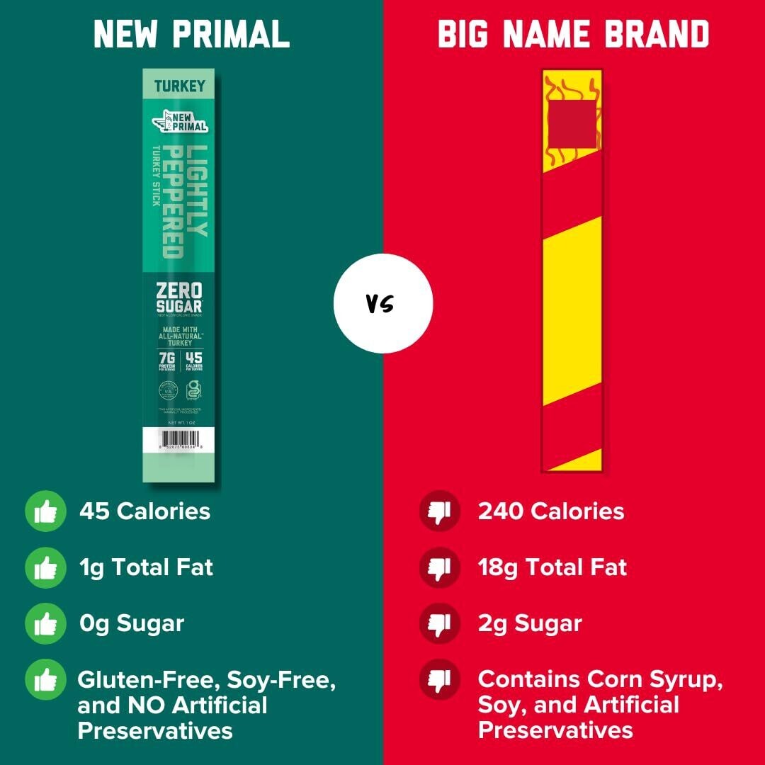 Dated 10/23/2025 ? LIGHTLY PEPPERED, TURKEY STICK: All-natural turkey mixed with the flavors you love from garlic, onion, ginger, and paprika formed into a delicious easy to eat stick that?s perfect for convenient snacking at home or on the go. This keto snack pack contains 20 - 1oz sticks! ? KETO, GLUTEN FREE SUGAR FREE: Top 8 allergen friendly! Our turkey jerky sticks are made with all-natural turkey, 0g of sugar, Whole30 approved, paleo, keto, and gluten free! ? 7G PROTEIN PER SERVING: New Primal turkey sticks are the perfect high protein snacks, that are portable and easy to eat. Feed your inner carnivore - each turkey meat stick has 7g of protein and just 45 calories per stick! ? HEALTHY SNACKS FOR ON THE GO: Our healthy snacks for adults are great for snacking anytime and anywhere, whether you're at the office, school, traveling, camping, backpacking, running errands, or relaxing at home. These mess free individually wrapped snacks are easy to eat on the go compared to beef jerky or other meat snacks! ? NEW PRIMAL: Try our full lineup of convenient, high protein, low sugar and low carb protein snacks. Pack crave-able flavors like Classic Beef, Spicy Beef, Buffalo Chicken and Cilantro Lime Turkey. Delicious, on-the-go snacking has never been easier!
