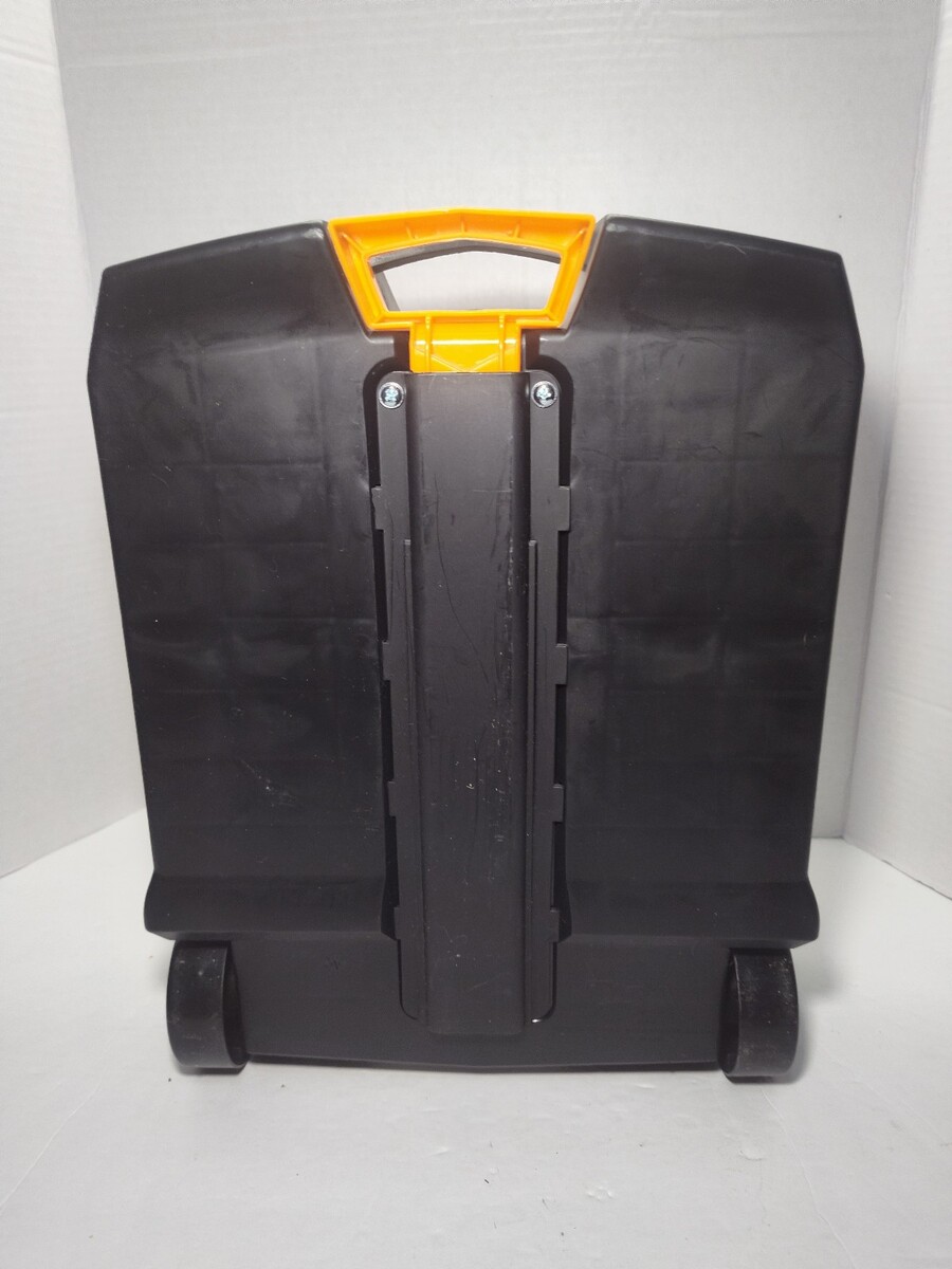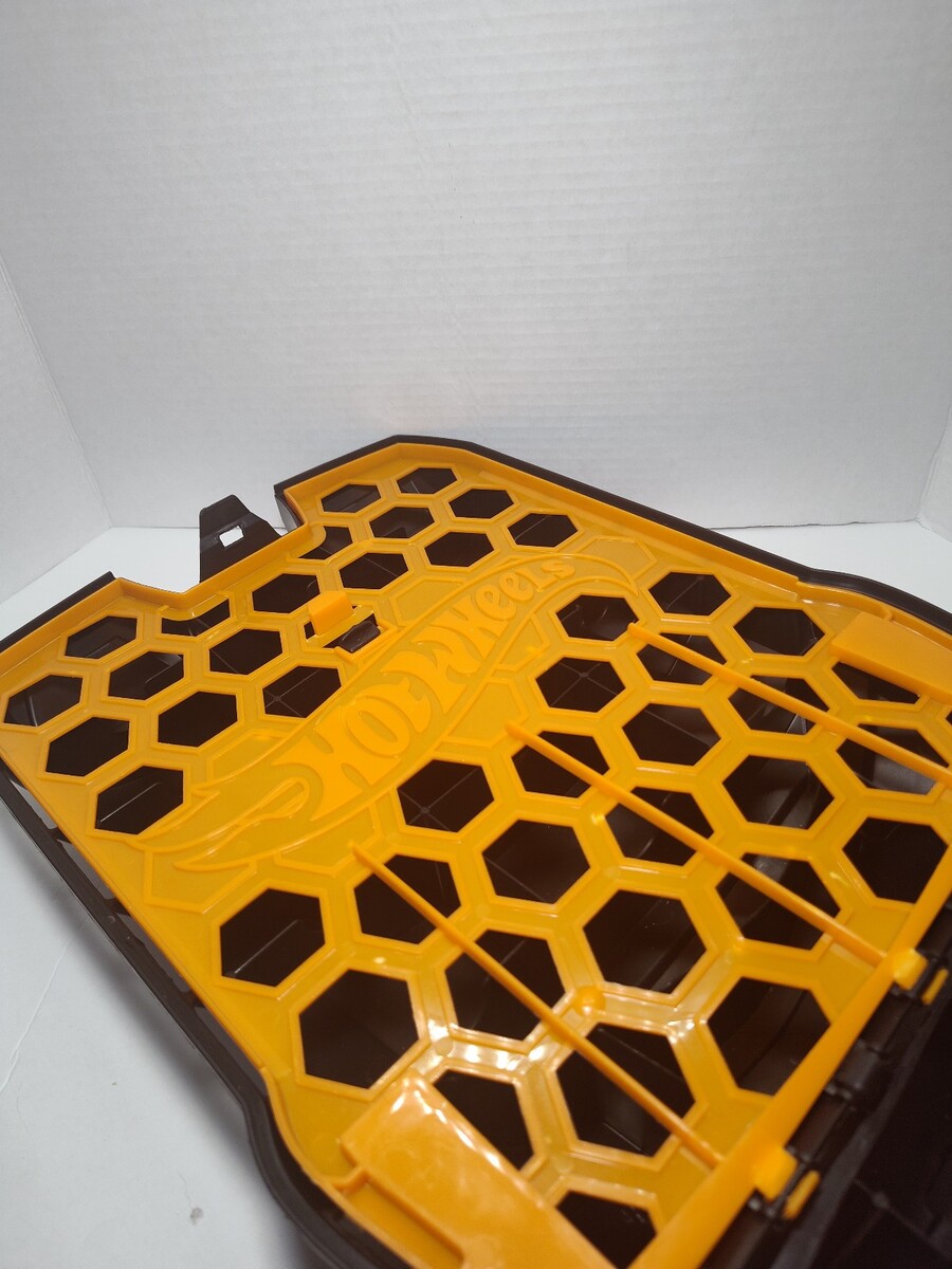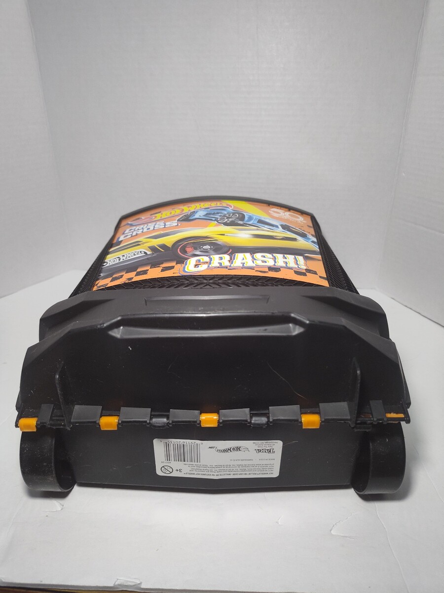 Official Hot Wheels Criss Cross Crash themed carrying case celebrating the 50th Anniversary. Designed to store and transport up to 100 Hot Wheels / 1:64 scale cars with individual compartments. Bright yellow and black design with rolling wheels and fold-out opening.