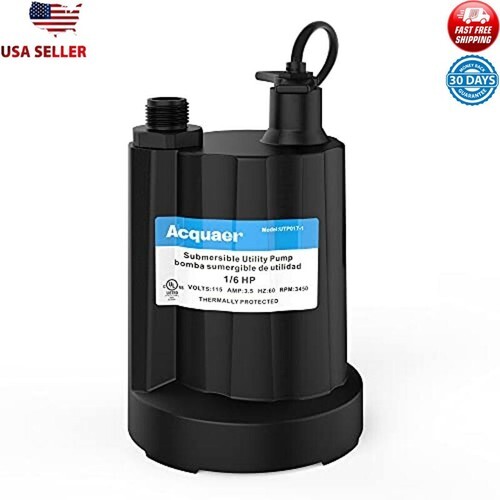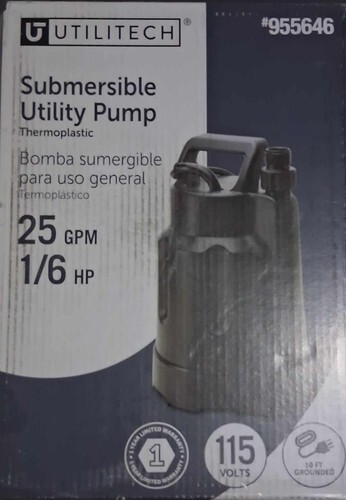 Master plumber, 1/6 hp submersible utility pump, 8' power cord, Garden hose Adapter, corrosion resistant body, 1470 gph, thermoplastic, pumps down to 3/16", 2 year warranty.
