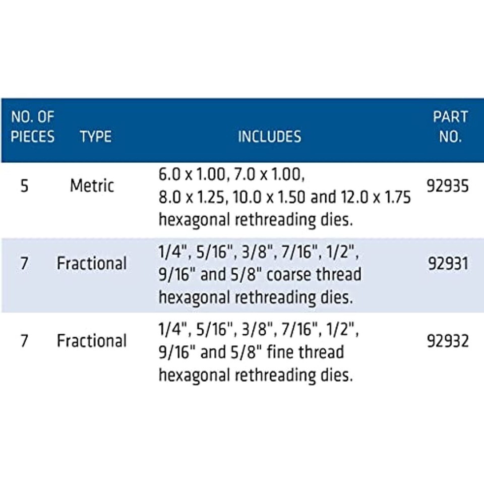 7 piece National Fine rethreading set includes 1/4" 5/16" 3/8" 7/16" 1/2" 9/16" and 5/8"