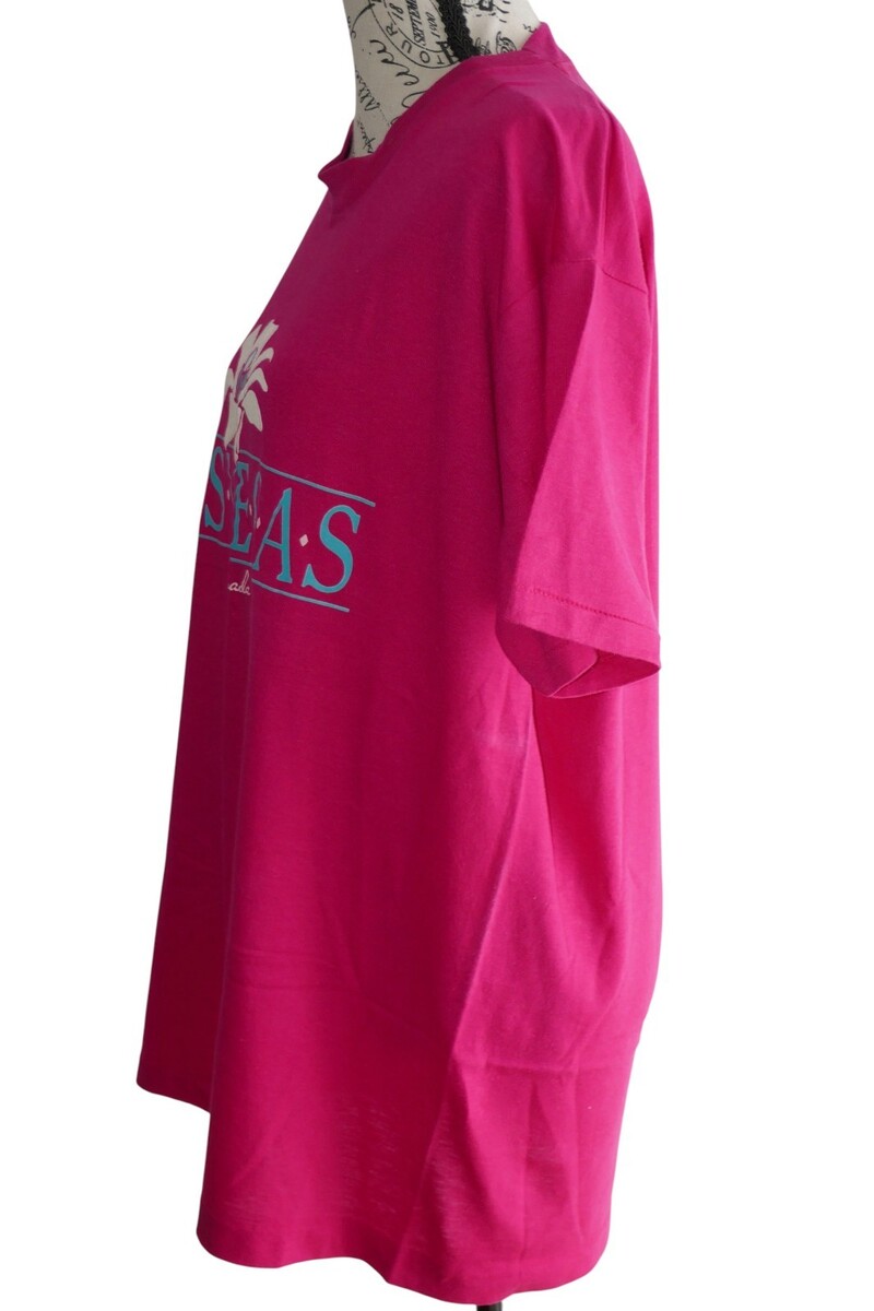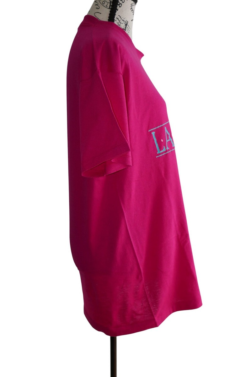 This vintage Las Vegas Nevada Graphic T-Shirt features a solid pink color with a round neck and short sleeves. The shirt measures approx. 21.75" from pit to pit and 29" from shoulder to bottom hem with 7.5" long sleeves. Made from a blend of polyester and cotton, this knit shirt is machine washable and perfect for all seasons.