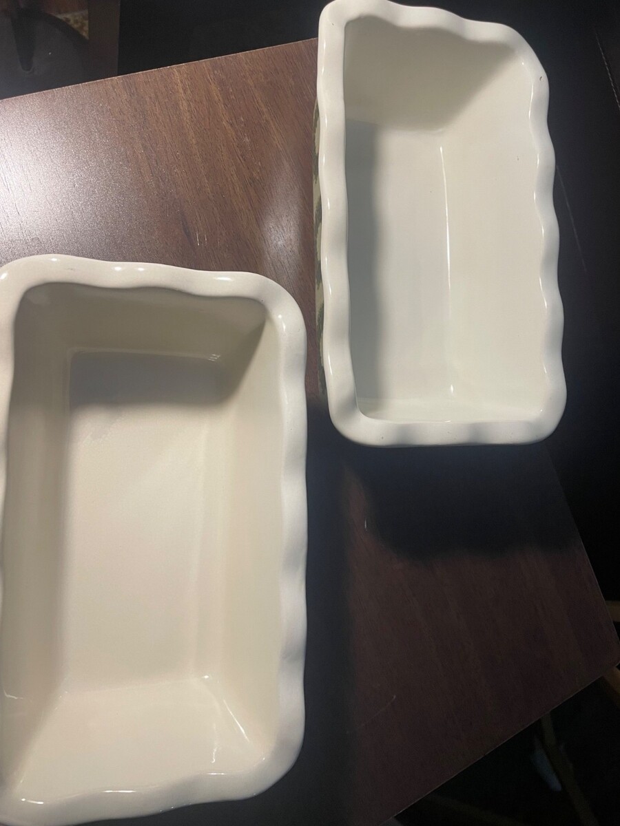 Pre-owned. Both dishes are in good overall condition with minor cosmetic wear from storage/use: small dings/discoloration along the top rim of both pieces, and light scratches/scuffs with slight discoloration around the bottom edges on each. No cracks noted. Please review photos closely for all details.