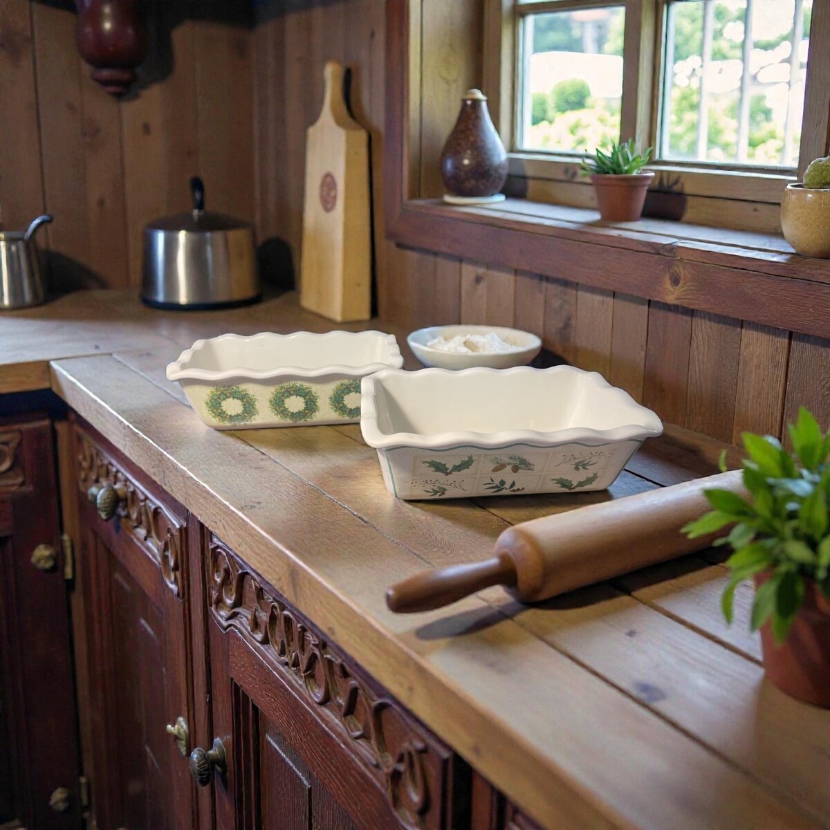 Add charming holiday style to your kitchen with this 2-piece Nantucket ceramic bakeware set. Both pieces feature a scalloped/wavy rim and festive winter patterns (wreaths + holly/pinecones). Great for baking, serving, gifting, or seasonal decor.