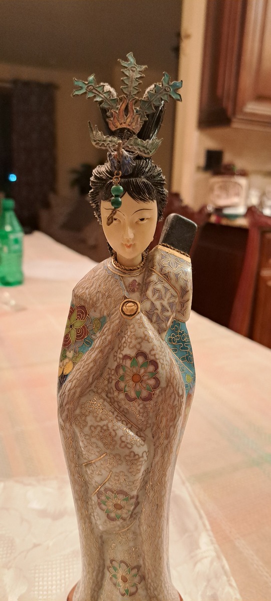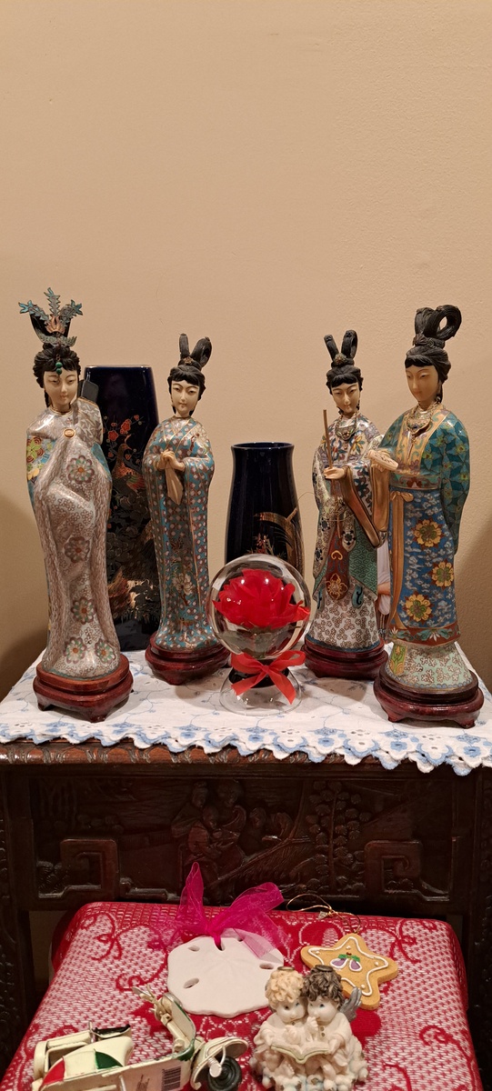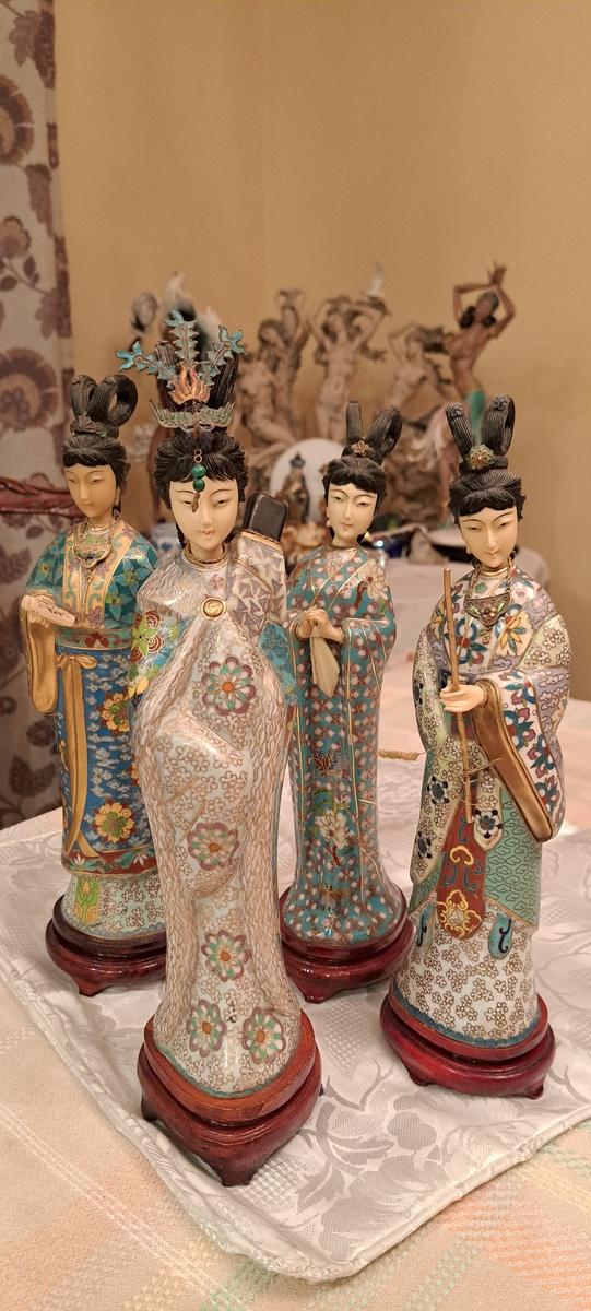 This is a set of 4 Ceremonial Geisha. In looking for a comparable, which I have done from time to time over the decades, I only found one figurine that could be said to be alike. She wasn't as pretty but her head and hands were hand carved bone, likely oxen, and here Kimino was made of enameled Cloisenne. Also the Base looked to be rosewood and was fastened with a flat head screw, not a phillips screw which was invented in the early 30s but weren't common untill a bit later. Anyway I found my single comp because I searched for anything with Geisha in the title and found here in the SOLD items. That was in 2005. In fact I just tried again without any success. Anyway FYI the sold figure I did find 20 years ago went for $3,500.00. Now if you just like the idea of a Giesha figurine, there are plenty of knock of dolls or toys, some with rather elaborite clothing ranging between $99-$500. I did see one in a case for $1,500 it looked like it may have been a puppet.