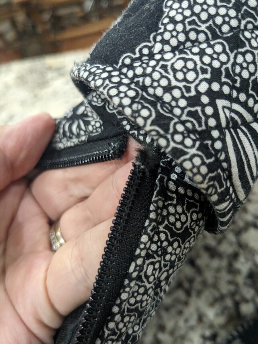 ZIPPER NEEDS TO BE REPLACED. Cotton fabric. Some wear and light staining to the straps, as shown. See all pics. ZIPPER NEEDS REPAIR.