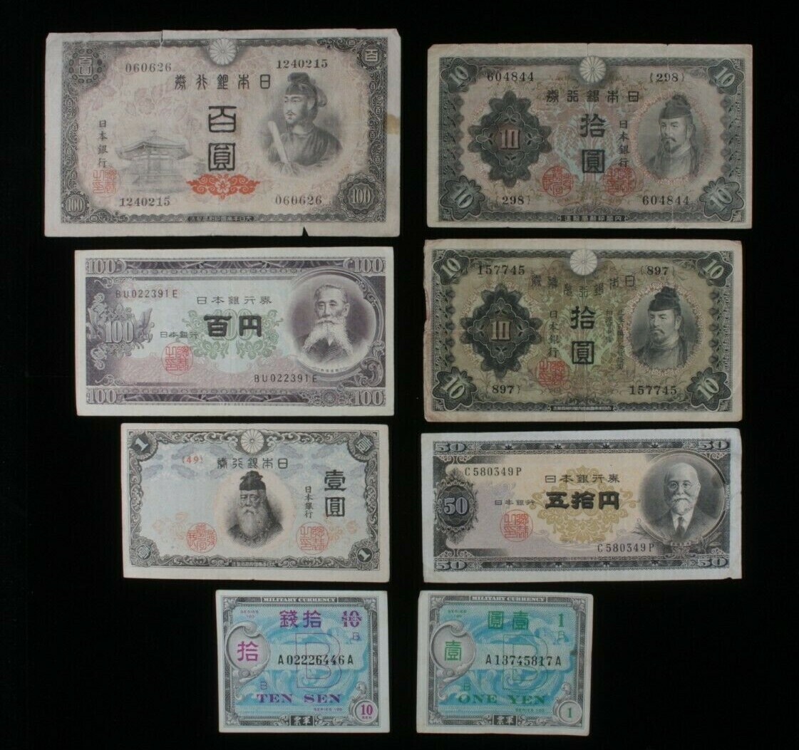 1930-1953 Giappone 8 noti set valutario // Imperial, militare alleato e yen moderno