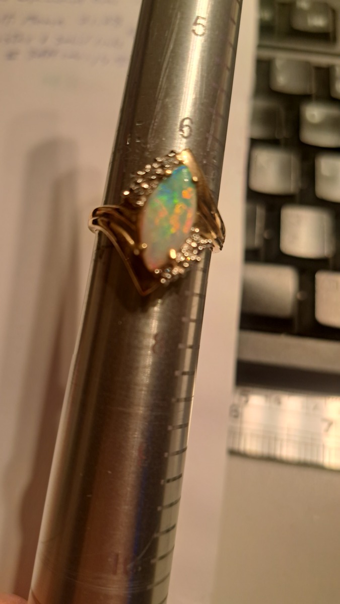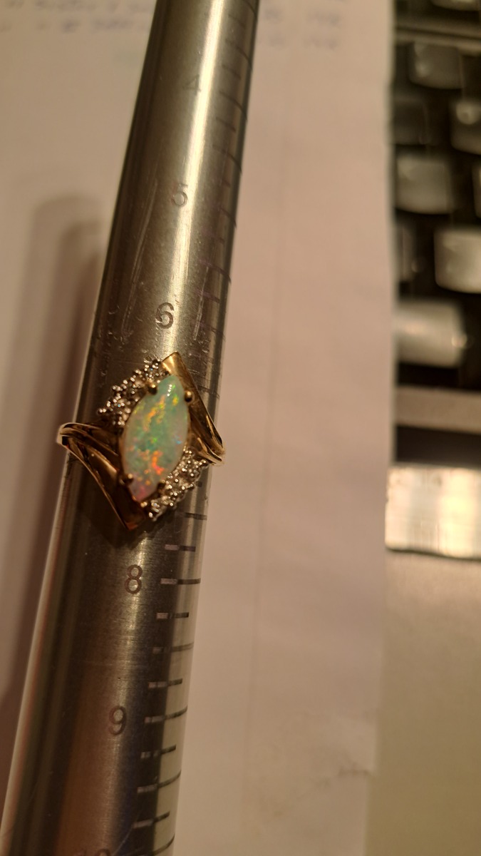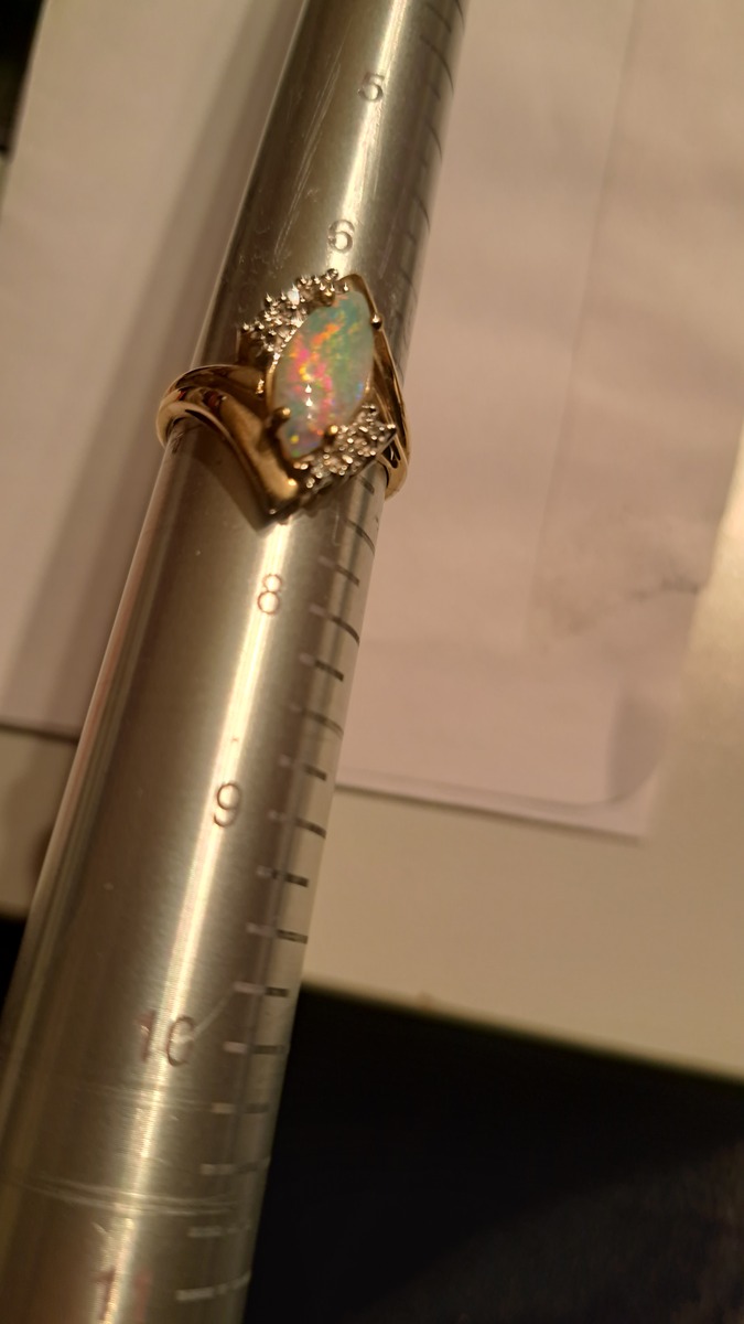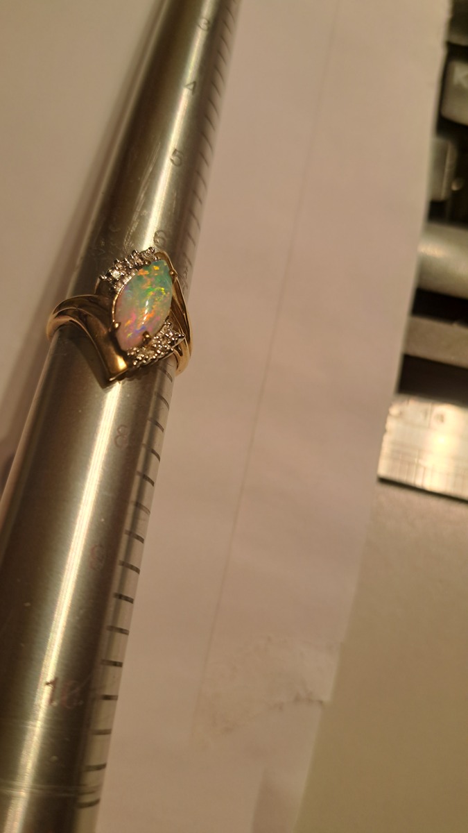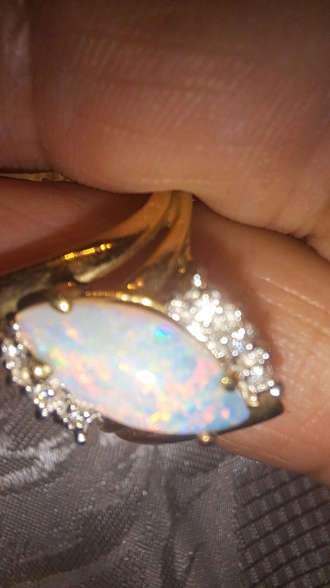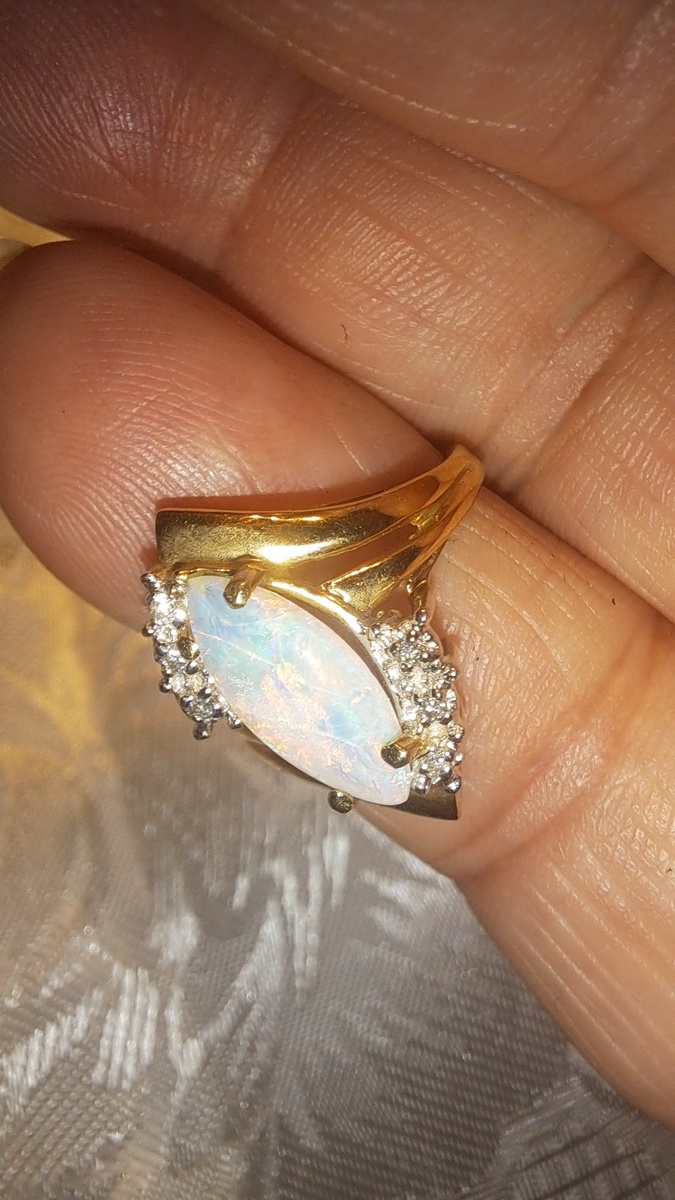 Oh my what a treat this Crystal Opal stone is. It's Vintage/New in that it's from the 80's but has never left the jewelers inventory. It's like you're getting something over 50 yoear old that's brand new! the fire in this stone is not something you see very often. In fact go out to a few high end stores and if you fond a stone this electric it will be in the $10k range assuming its natural and not grown in some lab. I don't know the carat weight on the opal. I know the arent dense like other gemestones so the tend to be lighter. If I had to guess I'd say its probably around 3 carats. I'm not pricing it on that or the accent diamonds that are so small I couldn't count them. I'm pricing this on the straight up pretty of the stone and the gold weight. If there are taxes in your state thates on you. The S,H, Insurance is on me. Note: this is currently listed on Facebook for $1,050.00 that's enough to cover your taxes, insurance and maybe some earings!