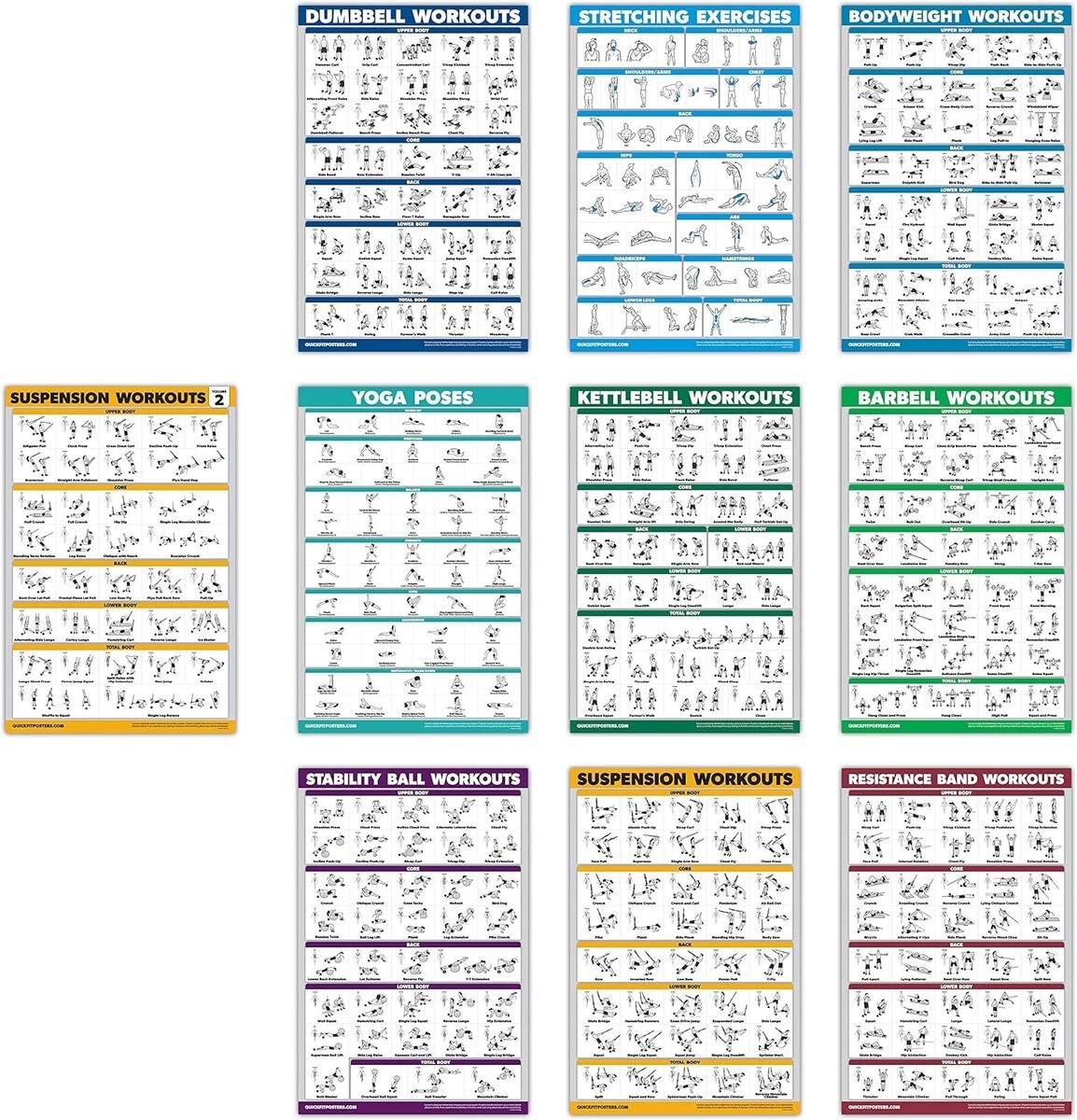 - Exercise Workout Poster Set - Suspension Volume 1 2, Dumbbell, Kettlebell, Resistance Bands, Stretching, Bodyweight,