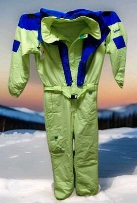 This vintage 1980s Obermeyer Ski Suit is a neon green one-piece snowsuit that exudes retro charm.
