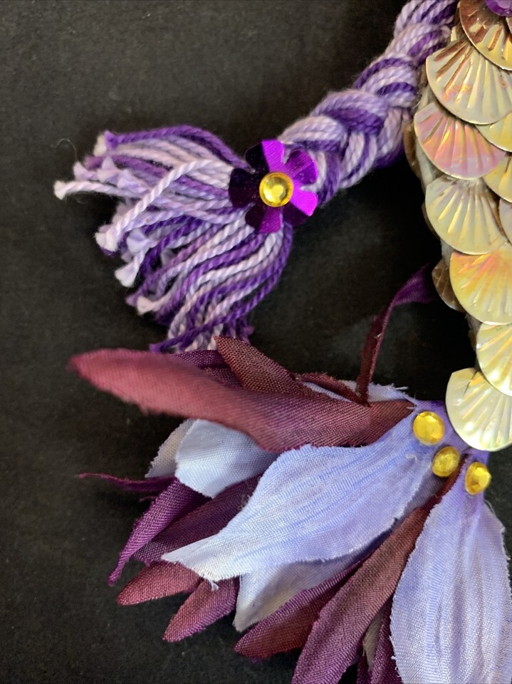 Gorgeous handmade ornament, just in time for the holidays. Purple mermaid holding a pom-pom sea urchin. Tail scales made of beautiful iridescent discs. Some hot glue and wiring peeking through on the side of tail.