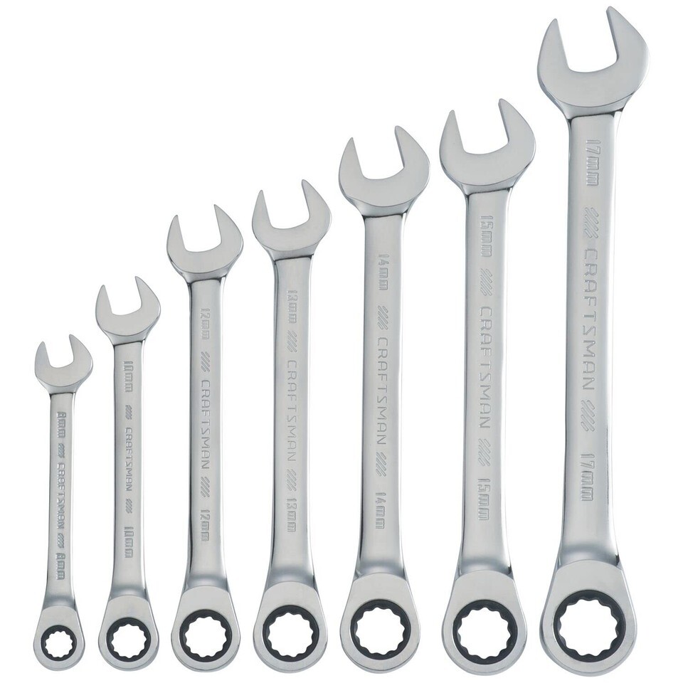 The CRAFTSMAN 7-piece Metric Ratcheting Combination Wrench Set offers a number of applications from the standard bolt turning to working on specific automotive repairs.