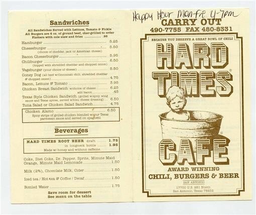 A small 4 page menu. Hard Times Cafe Menu. Serving Award Winning Chili at US 281 North in San Antonio Texas . Measures about 3 1/2" x 5 1/2" when closed.