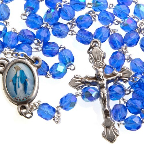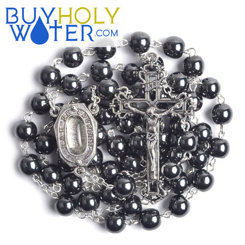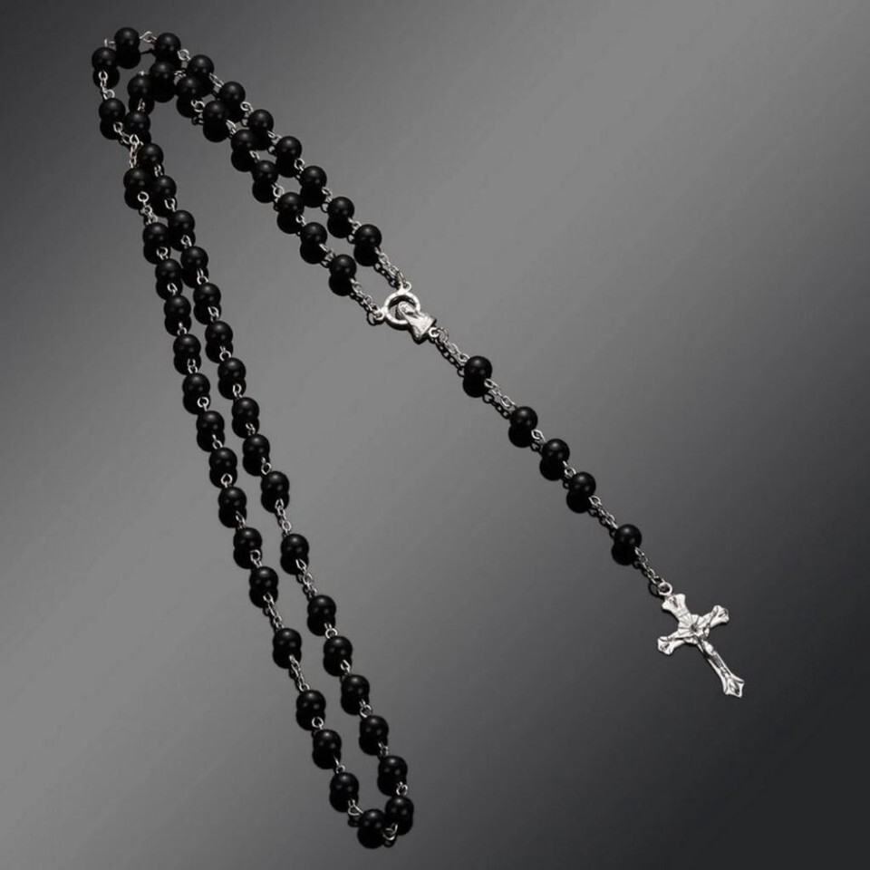 This rosary necklace is hand crafted with alloy metal and black resin beads and arrives to you new in sealed packaging.
