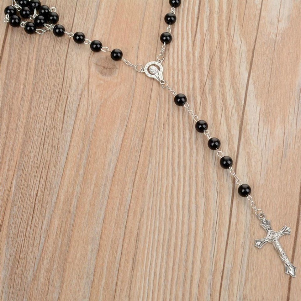 BLACK BEAD ROSARY 28" Necklace 6" Drop 6mm Prayer Beads Catholic Crucifix NEW