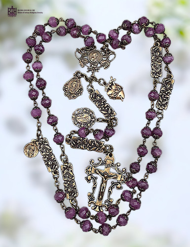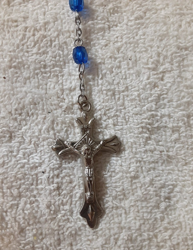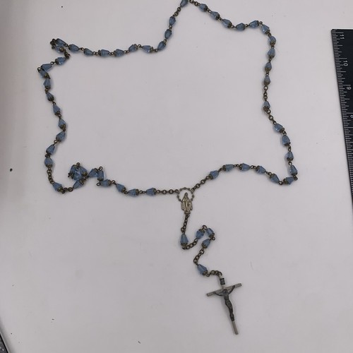 This rosary necklace is hand crafted with alloy metal beads and arrives to you new in sealed packaging.