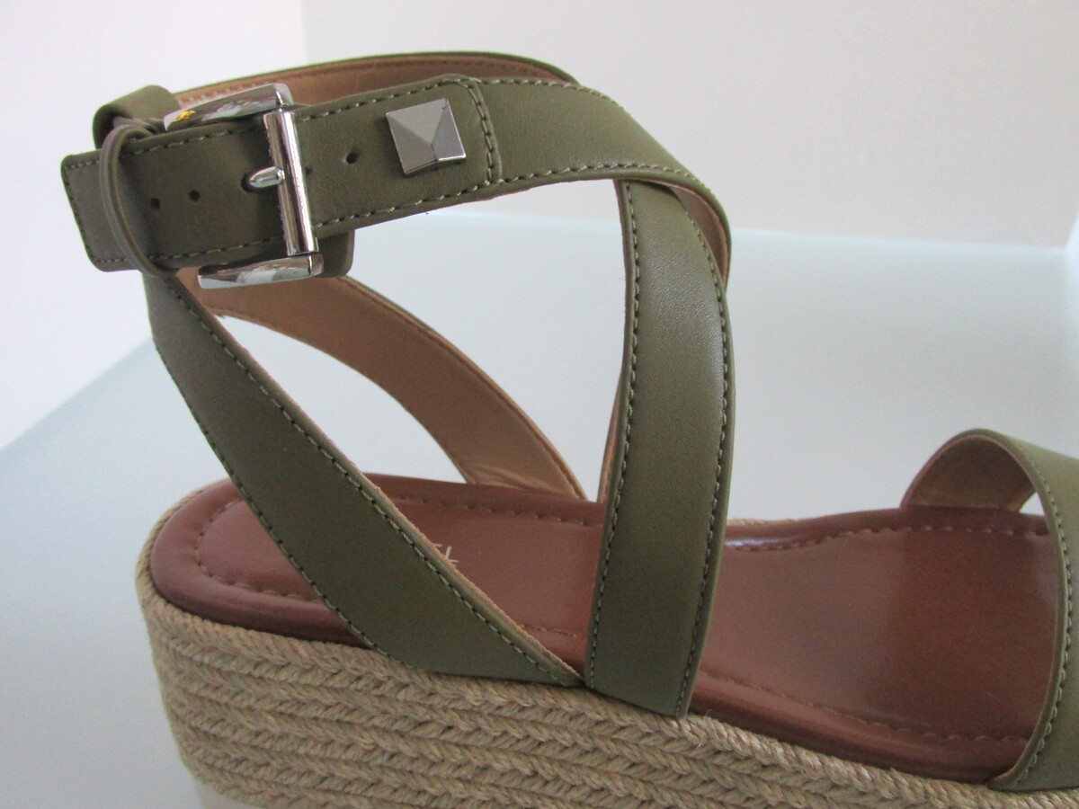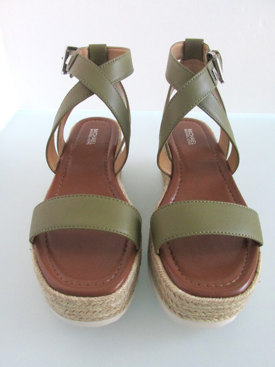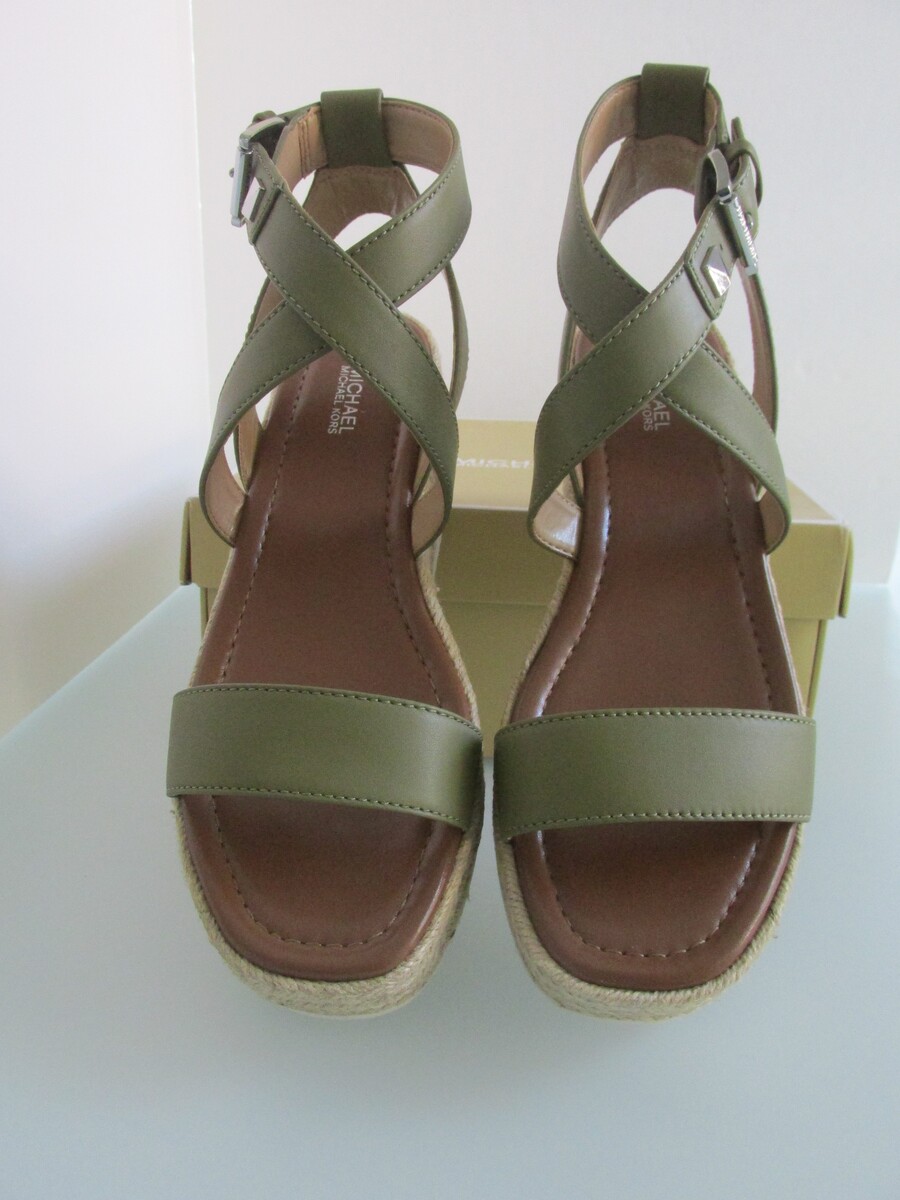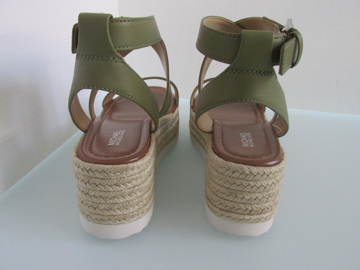 Description: Up for sale is a pair of Michael Kors "Lowry Wedge" new leather espadrille wedges. These leather wedges are US size 8 M and are olive green in color. They have leather uppers with a silver buckle on the ankle strap with a silver embellishment. They feature braided hemp sides on the 2.50" platform. These shoes come with the original box.