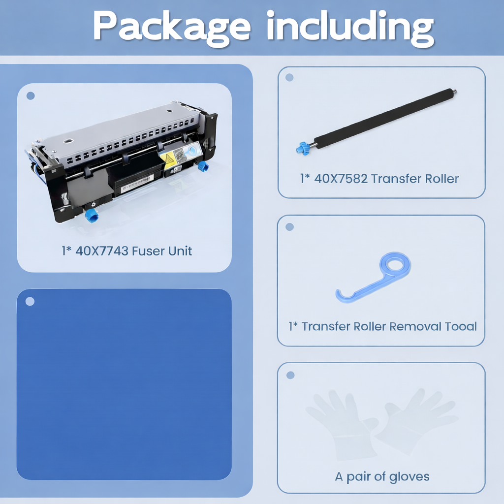 ??Specifications? : Voltage: 110/120V; Pages: About 200k pages. You wil get: 1*40X7743 Fuser unit, 1*40X7582 Transfer Roller, 6*40X7593 Tray 2-4 Pickup Rollers (3 Pairs of Tires), 1*Transfer Roller Removal Tooal, Gloves