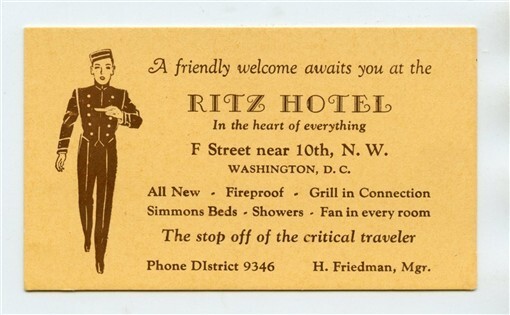 Ritz Hotel Business Card F Street Washington DC , circa 1940's. H Friedman , manager