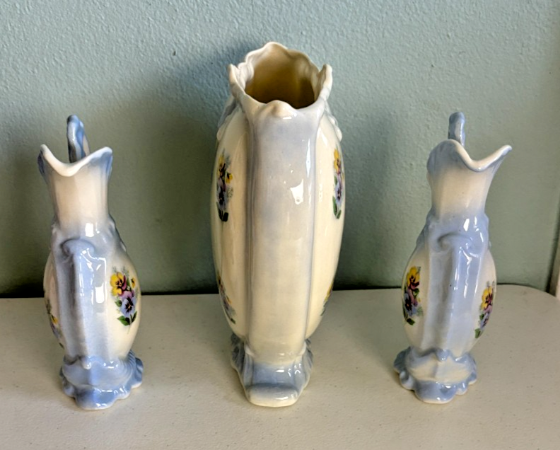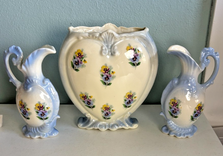 Floral Mid-Century Modern Ceramic Vase and Pitcher Set. Elegant cream and blue ceramic vase and pitcher set with pansy design. Perfect for home decor. All 3 of these were used as vases. The center heart shaped large one is 9.25? tall x 8.5? wide at the widest part x 2.75? deep. The two pitchers are 8? tall x 4? wide x 3? deep each. Excellent Used Condition with No cracks or chips- See Photos for further description
