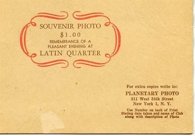 An empty souvenir photo folder from The World Famous Latin Quarter in New York City. There is NO photo in the folder. Measures about 6 1/2" x 8 1/2". Circa 1950's. A very nice remembrance of New York Night Life.