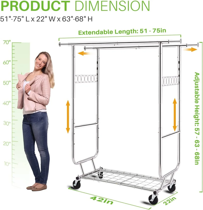 ?700lbs Max Load Capacity?- All-steel heavy duty clothes rack is solid and resistant to hold up to 700lbs. (500lbs on the double hanging rods. 200lbs on the bottom shelves for shoes and luggage storage.) It can meet all your extra garment storage needs. ?Say Goodbye to Wobbly Bending?- Our 3rd Generation rolling clothes rack uses special-shape (upgrade) structure for stronger support. With HOKEEPER commercial grade garment rack you can say goodbye to wobbly and bending racks. ?Mobile Clothes Rack Stable Guarantee?- 4 heavy duty omnidirectional casters for clothing rack with shelves, ensure flexible movement, smoothly across any flooring. 2 lockable casters (foot operated) keep it in place when stability is needed, guarantee the safety of your family. Notice: The clothes rack for hanging clothes also works while removing the casters. ?Fit Your Space Needs?- Dimension: 50.5-74" L x 21.6" W x 57-67.4" H. The extensible horizontal rods of double rail garment rack from 50.5" to 74" provides 3 times more space than ordinary single rail garment rack. Height adjustable from 57" to 67.4" accommodates short and long garments. You can adjust the length and height of rods to meet your space needs. ?3-in-1 Commercial Clothing Rack?- HOKEEPER clothing racks on wheels is integrated by garment rack, free standing shoe racks and umbrella rack. Great for organizing your clothing in bedroom or student dormitory, or drying clothes in laundry room, also a portable closet shelves in a boutique, showroom, retail store or flea market. ?Anti-corrosion Rust-off?- Our Freestanding Clothes Rack is Made of a Highly Resistant Metal With Durable Chrome Coating to Enhance Protection Against Water, Rust, Corrosion Scratch.