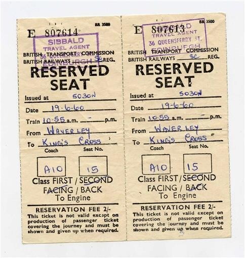 2 connected British Railways Reserved First Class Seat Forms from 1960. From Waverly to Kings Cross. Has a travel agent stamp.