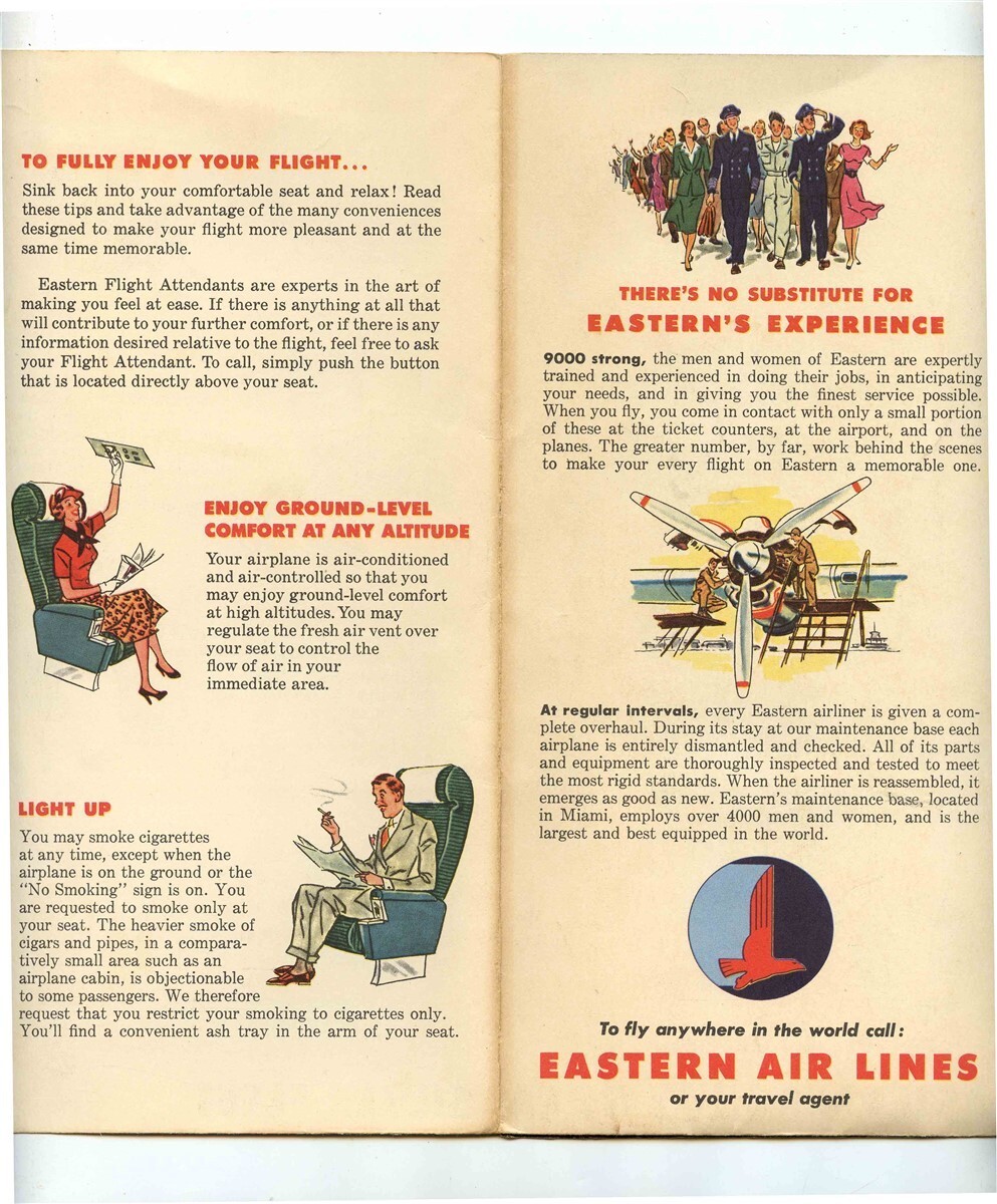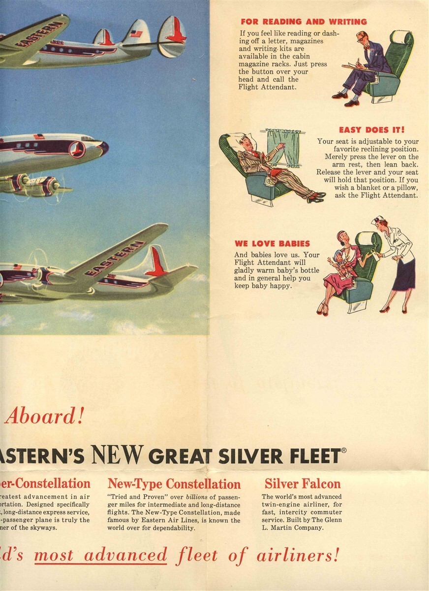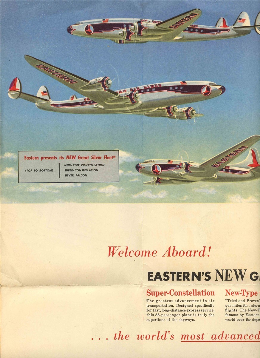 A 6 panel fold out with 3 interior pockets. EAL Eastern Airlines Your Souvenir Flight Pack and Contents . Great color images of the Eastern Fleet of Airplanes, including the New Constellation, Super Constellation and Silver Falcon . Contents included Hertz advertising brochure, Avis advertising brochure and Why the 2 and 3 Seating Arrangement in our 4 Airliners brochure. Circa 1950's.