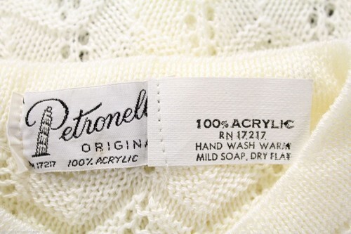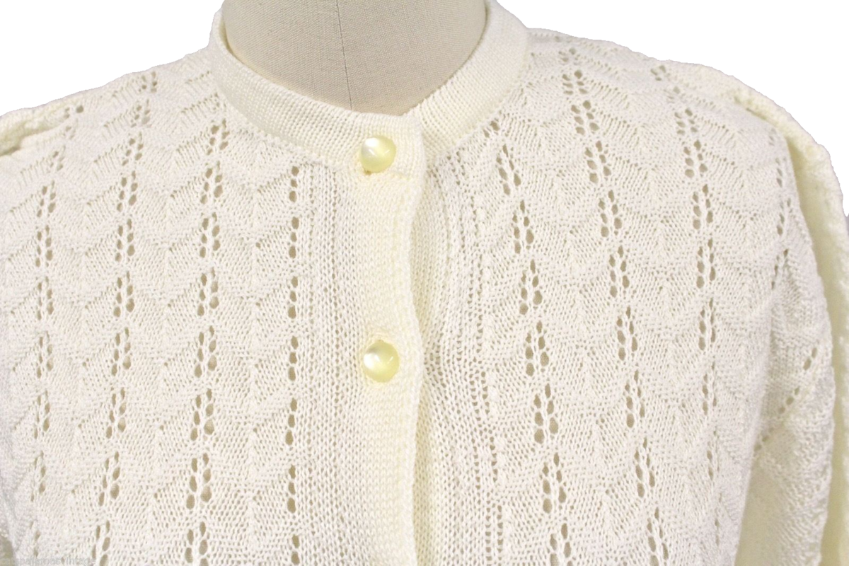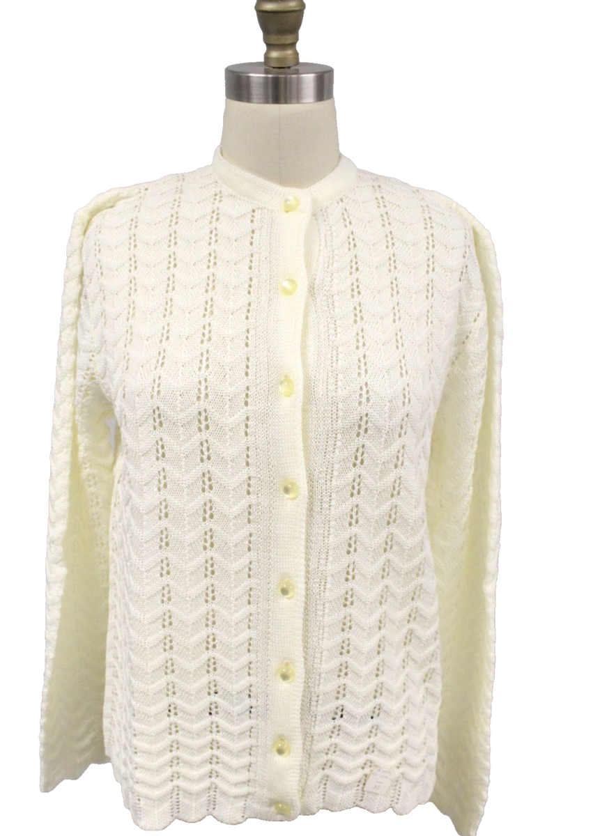 An immaculate piece of knitwear history, this vintage 1960s Petronelli cardigan is new with its original paper tags, qualifying it as New Old Stock. The cream-colored acrylic knit features a sophisticated diagonal chevron pattern, creating a refined texture. The half-sphere pale yellow buttons provide a charming contrast and enhance the sweater's delicate appeal. This is a rare find in perfect, unworn condition, making it a valuable addition to any collection. Owning this garment is not only a nod to timeless style but also a choice for sustainable fashion, giving new life to a piece that has been preserved for decades.