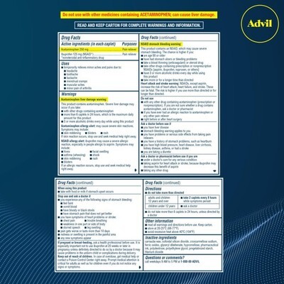 Expiration Date of 3/2028 ? TWO boxes of 72 Advil Dual Action Coated Caplets with Acetaminophen, 250 Mg Ibuprofen and 500 Mg Acetaminophen Per Dose (2 Dose Equivalent) for 8 Hour Pain Relief ? Advil Dual Action coated tablets relieve pain with ibuprofen to target pain at the source and acetaminophen to block pain signals - the perfect addition to your college dorm room essentials ? New packaging will feature 20% less plastic to keep nearly 500,000 pounds of plastic out of landfills ? Multi symptom pain medication that provides headache, toothache, menstrual cramp, muscle pain and lower back pain relief while also relieving minor aches and pains associated with arthritis ? Easy to swallow pain medicine that provides longer lasting relief than Tylenol Extra Strength and targets pain at the sight of inflammation ? The first pain relief medication with a combination of acetaminophen and ibuprofen ? Pain pills that relieve pain in two ways, providing powerful relief with a lower maximum daily dose of each medication ? Advil is a top selling OTC pain reliever, providing safe and effective pain relief when used as directed for more than 35 years ? HSA and FSA eligible products